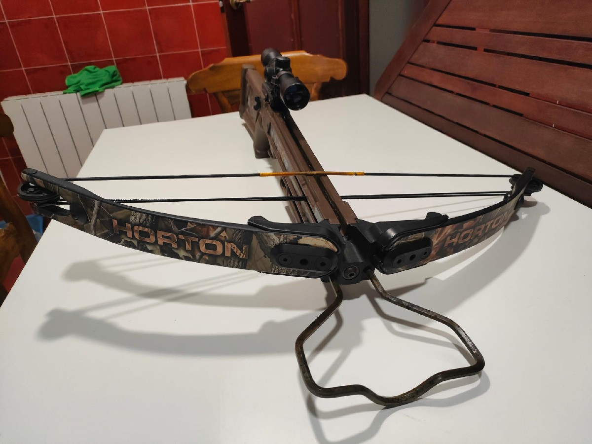 Se vende ballesta Horton Summit 150 lista para usar y con potencia de 150 lbs. Ha sido usada pero está bien cuidada, con marcas normales de uso únicamente estéticas y sin problemas mecánicos, perfecta para tiro recreativo o caza. Se entrega con kit de accesorios que incluye: visor BSA, funda, lubricante de rail, cera para cuerda, dos cuerdas de repuesto, carcaj y 12 flechas completamente nuevas (puntas de flecha para caza no incluidas). Se requiere licencia tipo E.