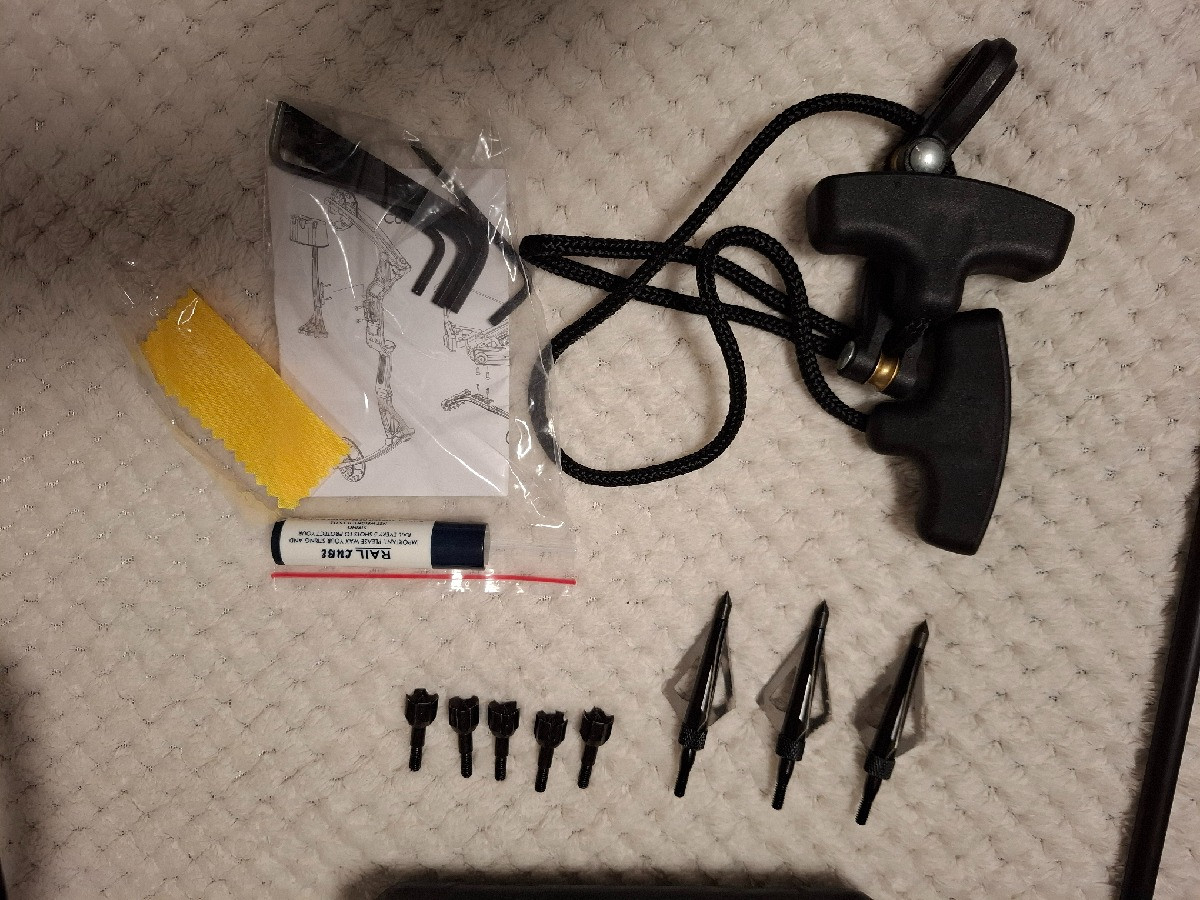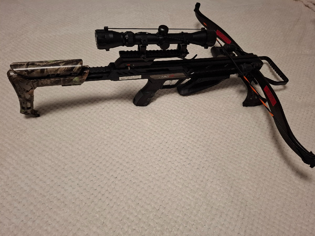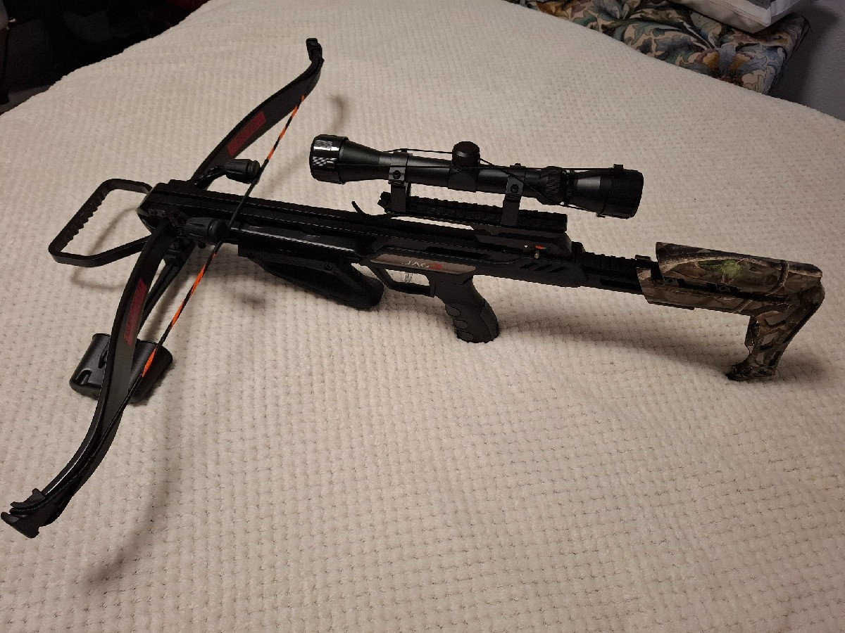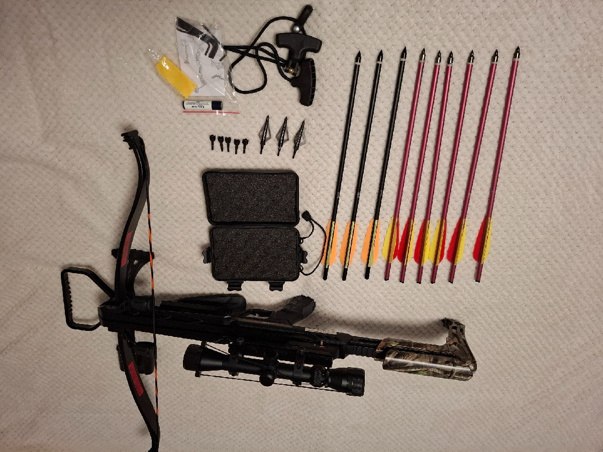 Ballesta recurva totalmente equipada. Tiene doble seguro, culata regulable y cuerda nueva sin uso. Dos visores: uno de 3 puntos rojos y otro visor a tres distancias. Trae su carcaj para 3 flechas montado en la ballesta. Aparte trae su cargador, cera, 9 flechas de aluminio con nueve puntas de entrenamiento, tres puntas de caza mayor de triple hoja intercambiables y 5 puntas para caza menor (por impacto) + caja de plástico acolchada para llevar las puntas. Viene con funda negra de doble bolsillo. Nueva a estrenar, se compró por capricho y no se ha usado.