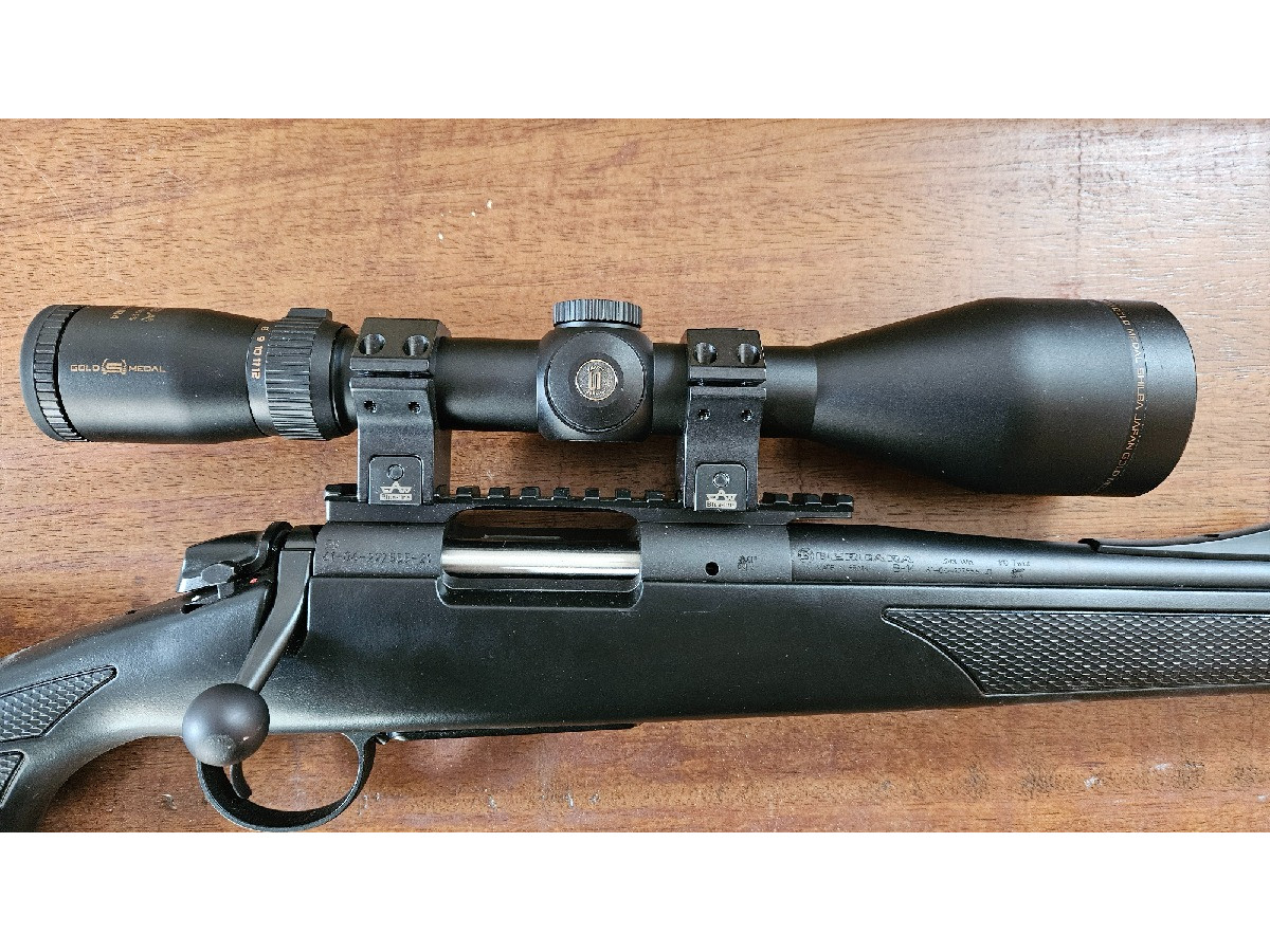 Está completo. Alza, punto de mira, rail Weaver, monturas Apel Blue Line. Más mira Shilba Gold Medal 3-12x56. Todo nuevo a estrenar. El rifle aún tiene la pegatina del cañón. Valorado en más de 1400 euros.