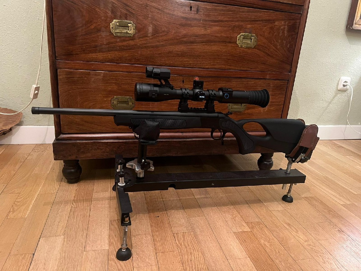 Bergara monotiro con visor Pard 35/70 con telémetro, en calibre .308 y con monturas Weaver. Se incluye funda Bergara pequeña donde cabe el rifle desmontado.
