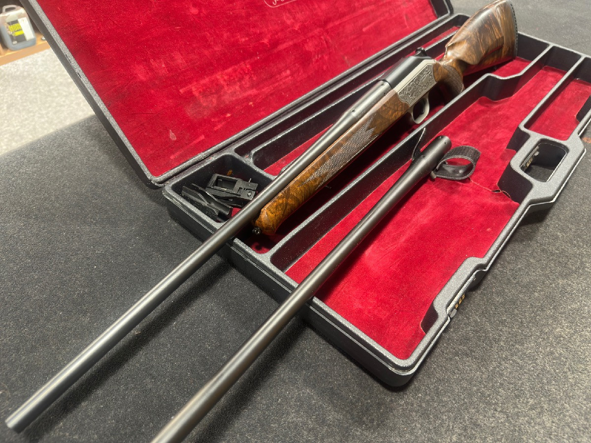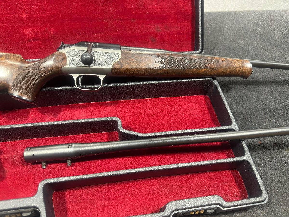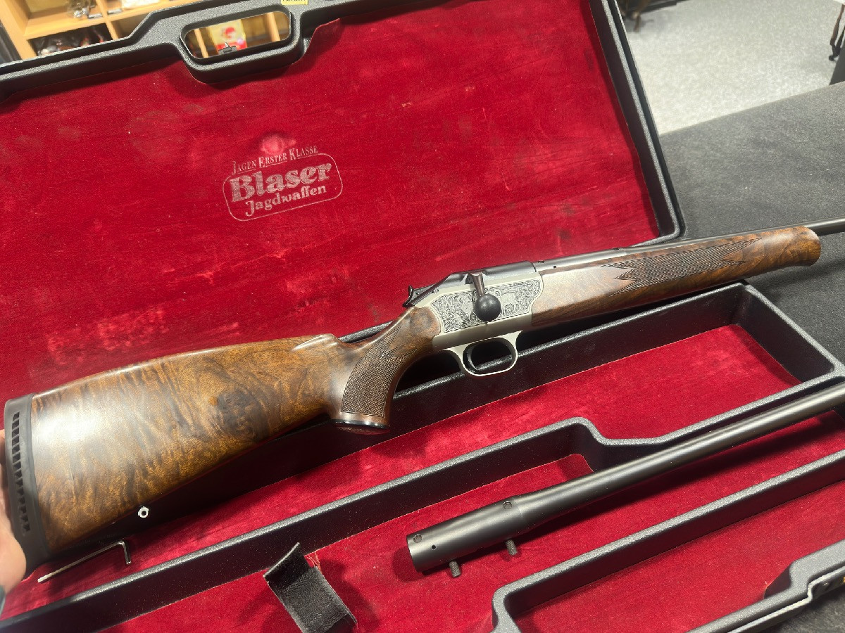 Vendo rifle Blaser, modelo Luxus con maderas de grado y pletinas grabadas. Calibre 30-06 + cañón adicional calibre 243 Win. El estado del arma es perfecto, ni una sola marca, ni arañazo, ni golpe alguno por ningún sitio. Maletín para doble cañón de regalo.