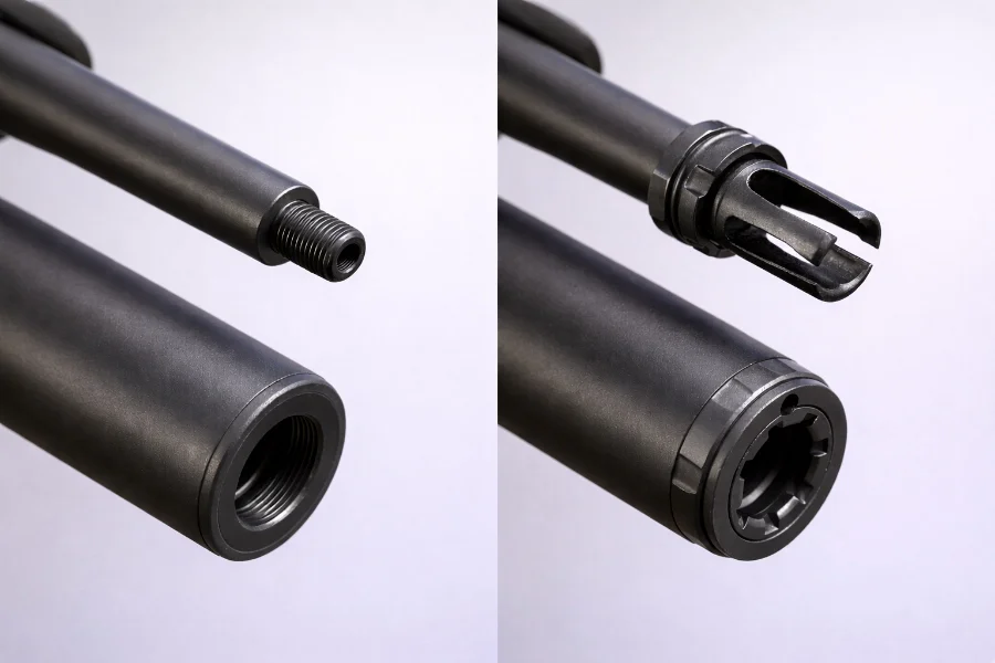 - Rosca directa: se enrosca directamente al cañón mediante una rosca mecanizada en la boca del rifle. Es el sistema más común por su simplicidad y fiabilidad. Ofrece una excelente alineación cuando la rosca está correctamente mecanizada y permite una fijación firme sin piezas adicionales. Es una opción muy utilizada en rifles de cerrojo y carabinas de aire comprimido. Sin embargo, requiere comprobar con precisión el tipo y paso de rosca (M14x1, 1/2×28, etc.), ya que una incompatibilidad puede afectar tanto a la seguridad como al rendimiento.