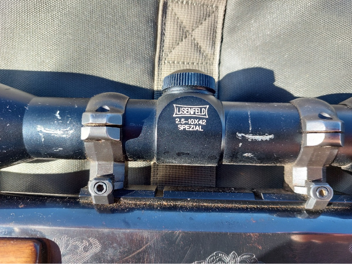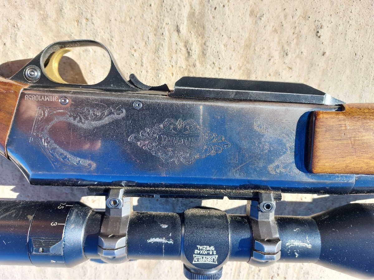 Rifle semiautomático Browning BAR II Safari en calibre 30.06. Visor Lisenfeld 2,5-10x42 Special Jaguar. Cañón de 55 cm y cargador de 2 balas + recámara. Funda y correa incluidas. Con algunas marcas en visor y arma (ver fotografías) pero en perfecto estado de funcionamiento. Se vende por cese de actividad. Actualmente se encuentra en la provincia de Toledo, pero se podría llevar para verlo al sur de Madrid.