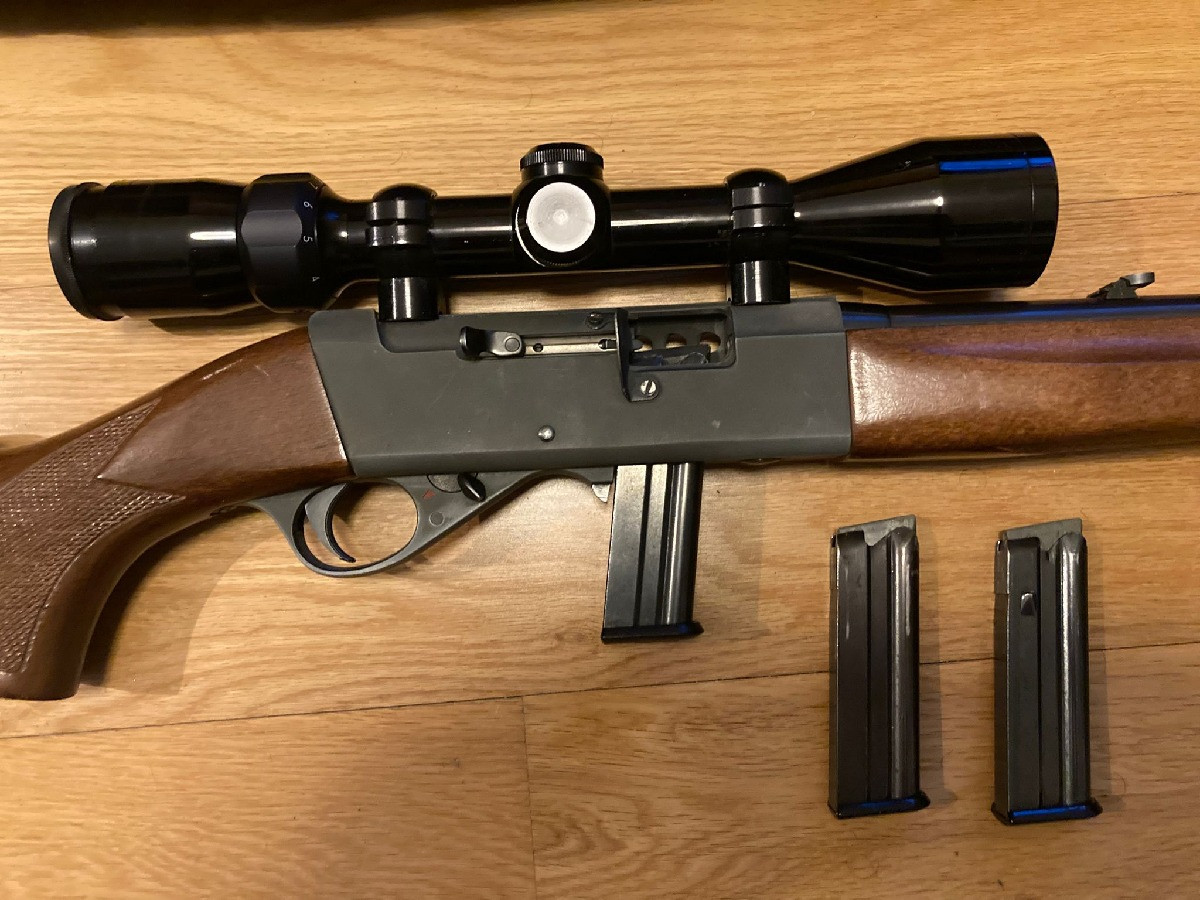 Carabina semiautomática Anschutz Cal. 22LR, incluye funda, mira telescópica Bushnell y tres cargadores.