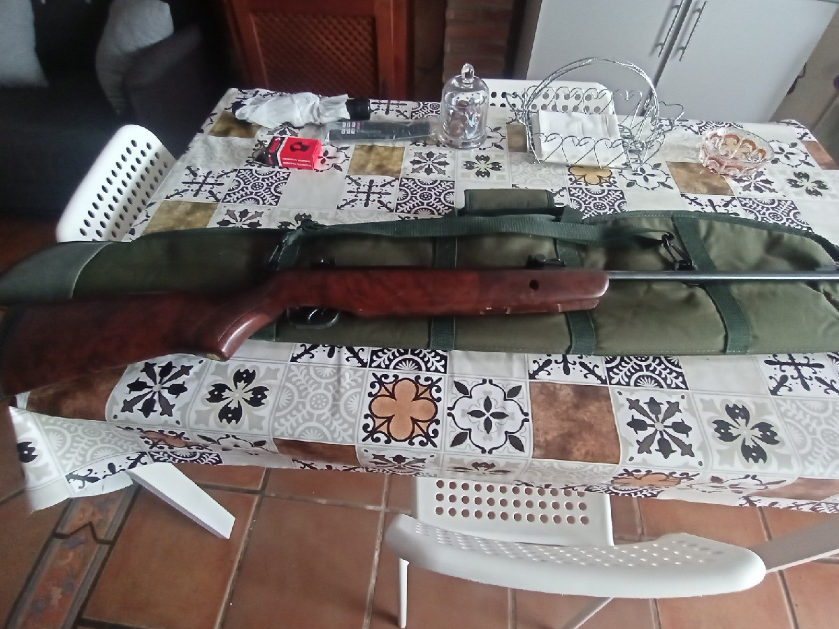 Es una carabina Gamo Hunter 440 WT, es una serie limitada toda en madera de nogal, muy potente. Guardada 20 años, apenas se usó. Tiene visor Crosman 4x32 de calidad, se entrega con funda.