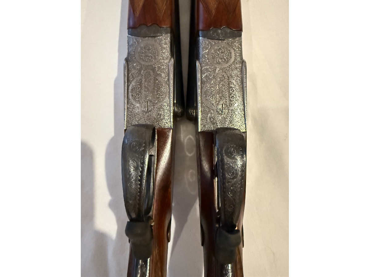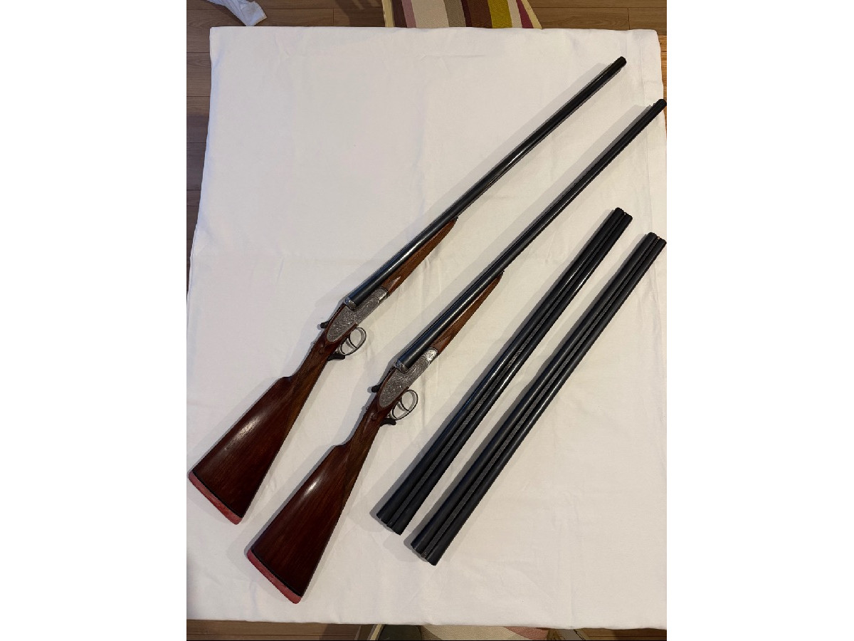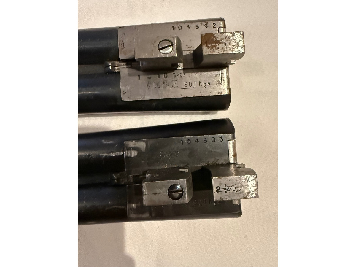Pareja de escopetas paralelas Ignacio Ugartechea – pletina larga (sidelock) con expulsores automáticos. Se trata de una auténtica pareja (I y II) con numeración correlativa (104592 y 104593), en muy buen estado de conservación. Escopetas de gama alta dentro de Ugartechea, con grabados finos tipo inglés y maderas bien conservadas. Incluyen segundo juego de cañones para tiro de pichón, lo que las convierte en un conjunto especialmente interesante tanto para uso como para colección. Funcionamiento perfecto, buen ajuste y cañones en buen estado. DifÃcil encontrar una pareja de estas caracterÃsticas con doble juego de cañones. Precio: 14.000 € (negociables). Se pueden ver sin compromiso. Transferencia por Intervención de Armas de la Guardia Civil.