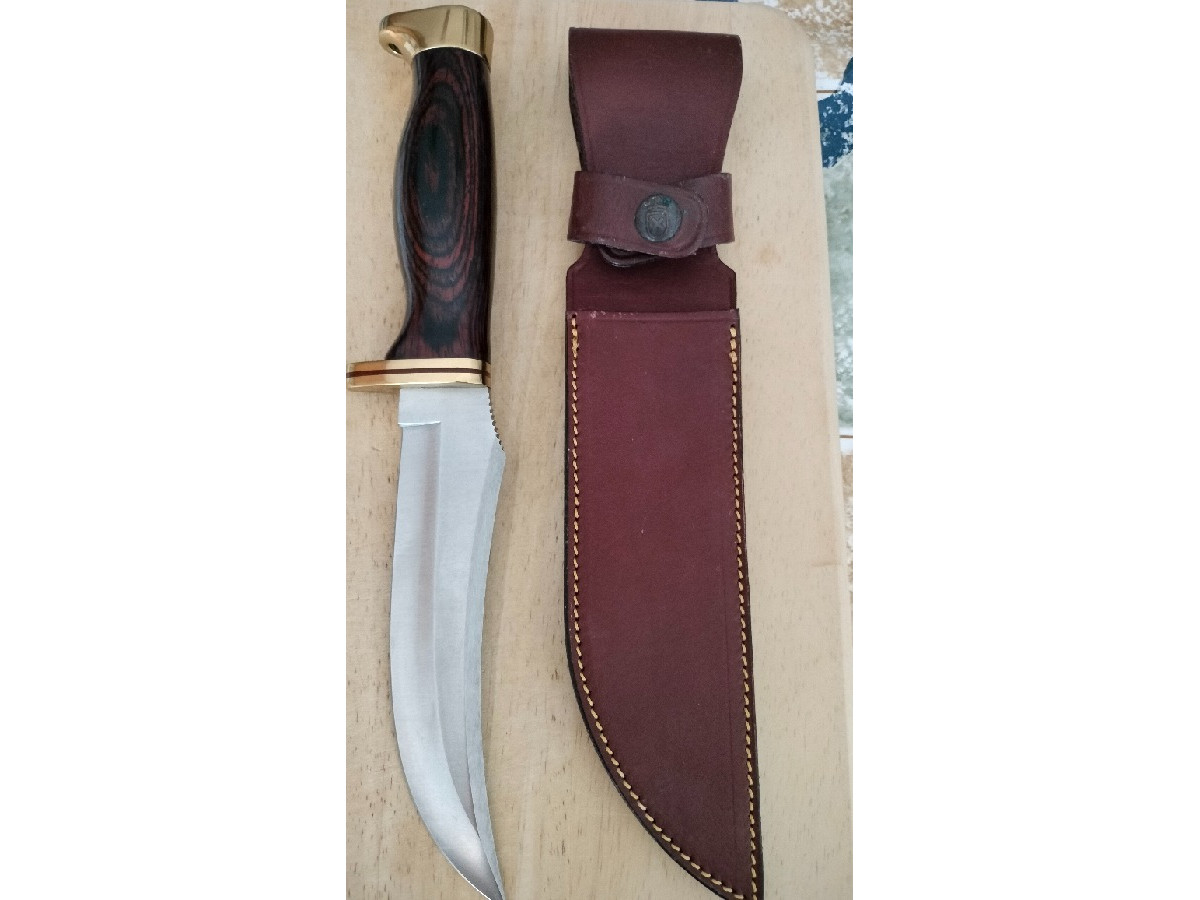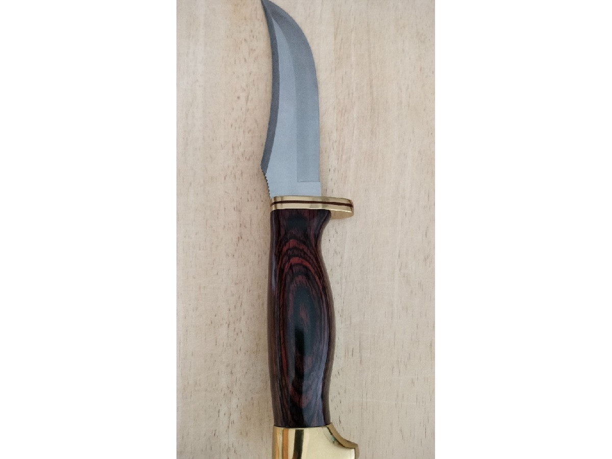 El cuchillo es de acero inoxidable al CrMoV, pomo y guarda de latón, el cabo es de madera creo palisandro.