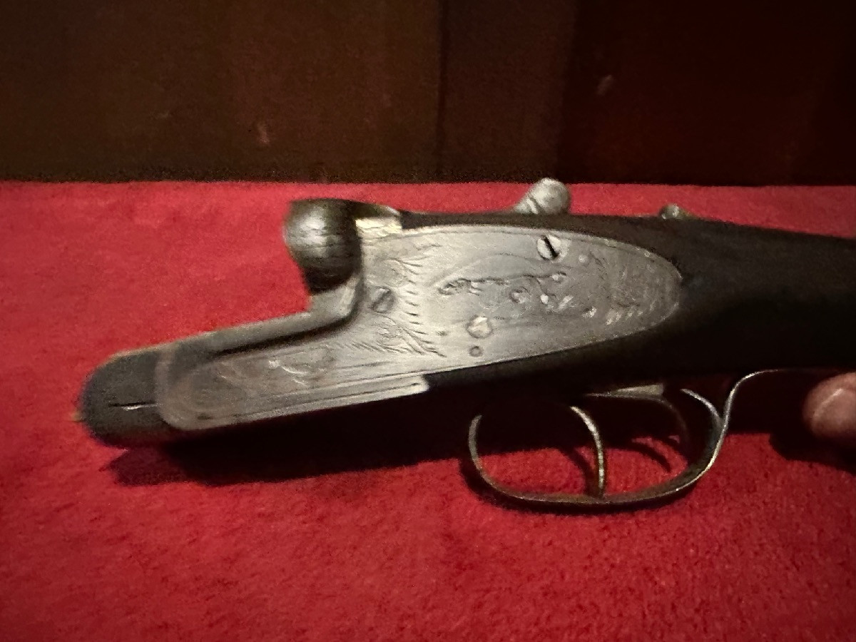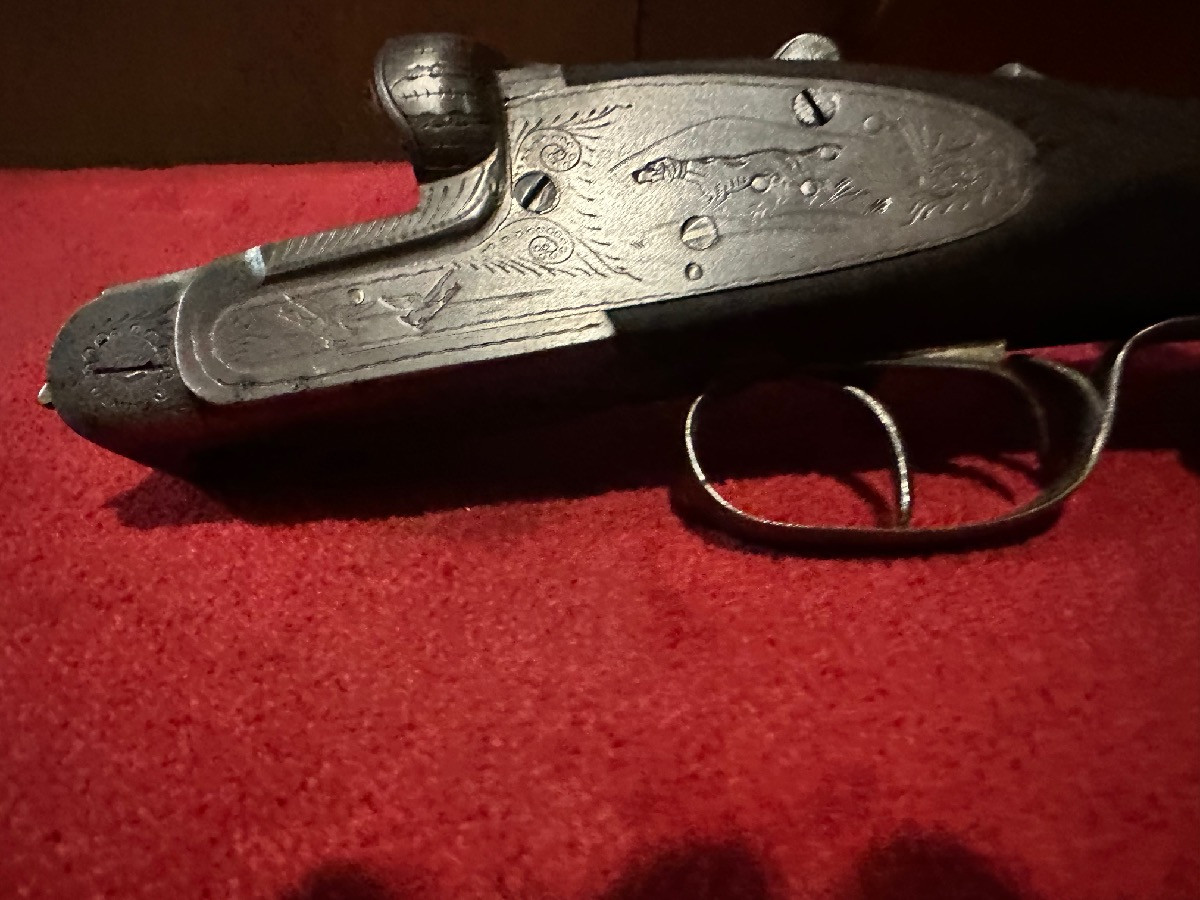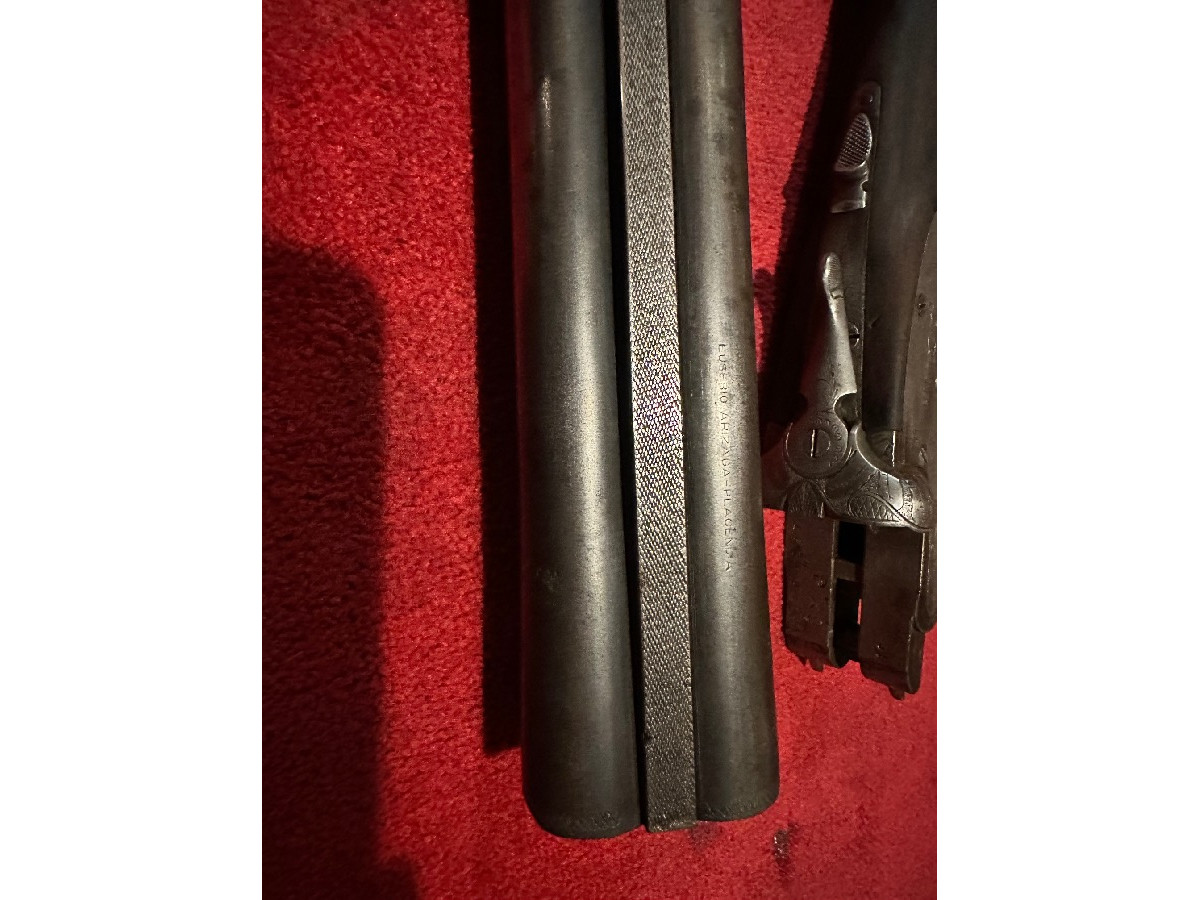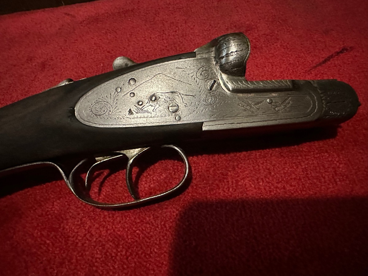 Escopeta española clásica de doble gatillo, fabricada en Placencia. Robusta y funcional, con grabados de caza y en buen estado general, con uso normal para su edad. Ideal para caza menor o colección.