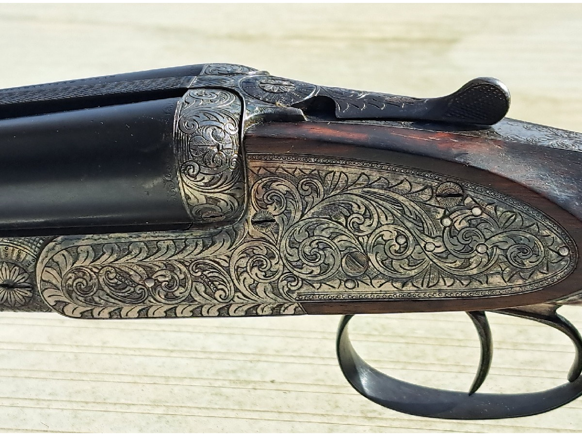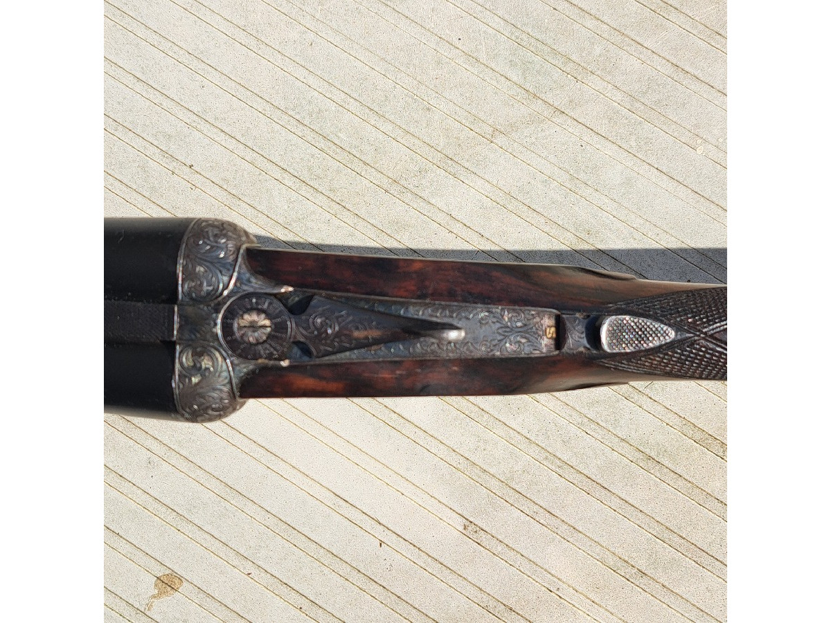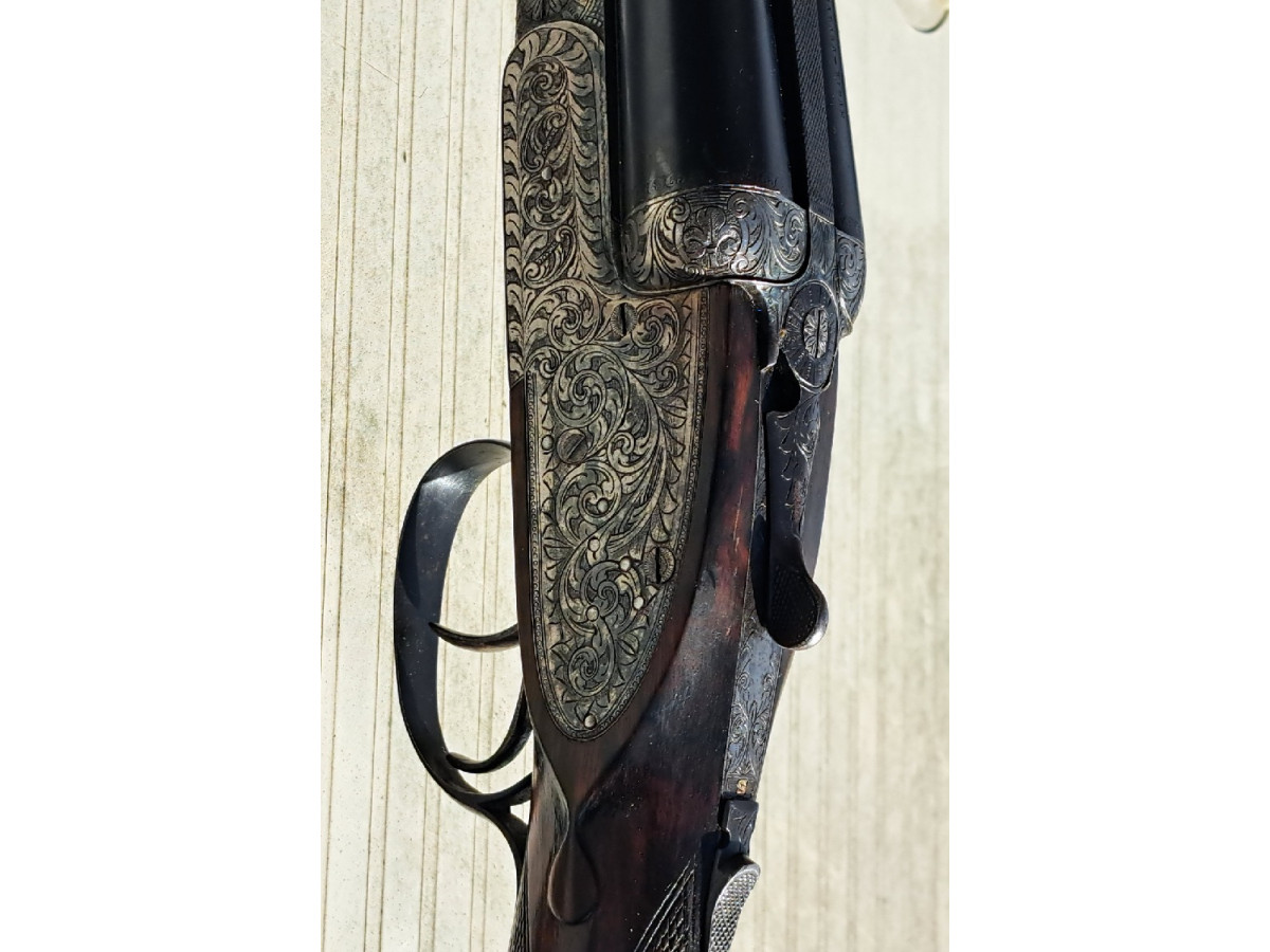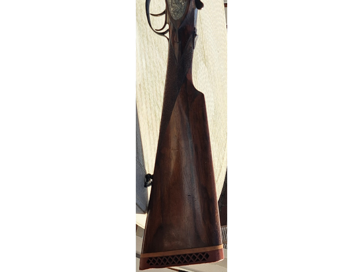 Escopeta Luis Arrizabalaga. Calibre 12. Con choques de tres y una estrellas. Grabados en cajón y guardamonte. Culata inglesa de nogal. Pocos disparos. Conservación propia de uso. Maletín de transporte desmontada a medida.
