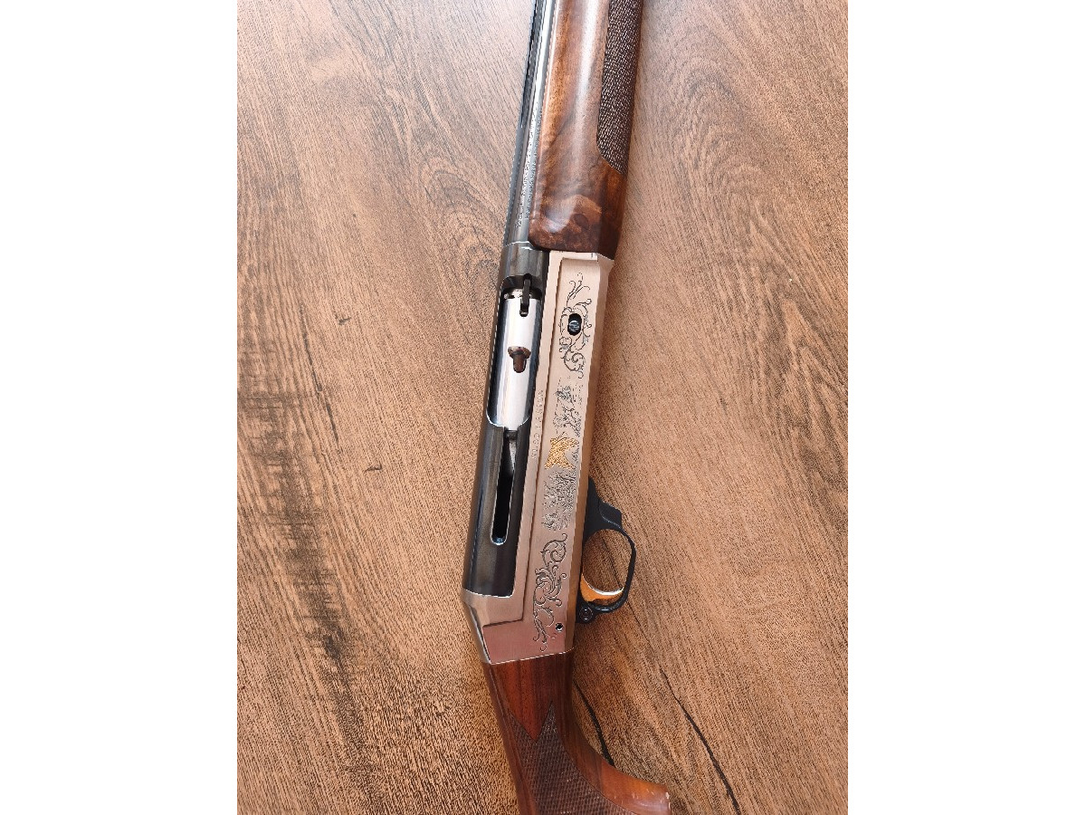 Escopeta semiautomática de la casa Benelli, con bonitos grabados. La escopeta va muy bien. No se encasquilla ni nada.
