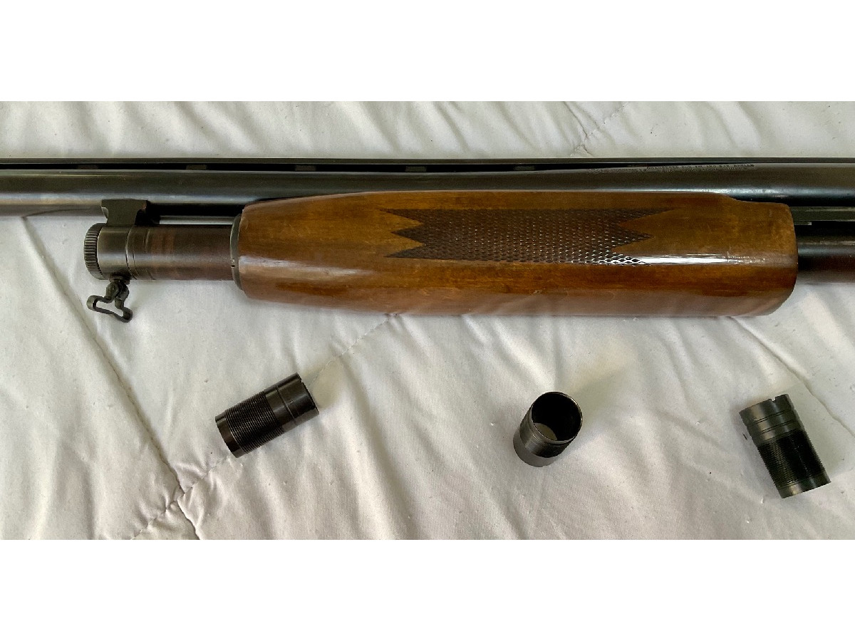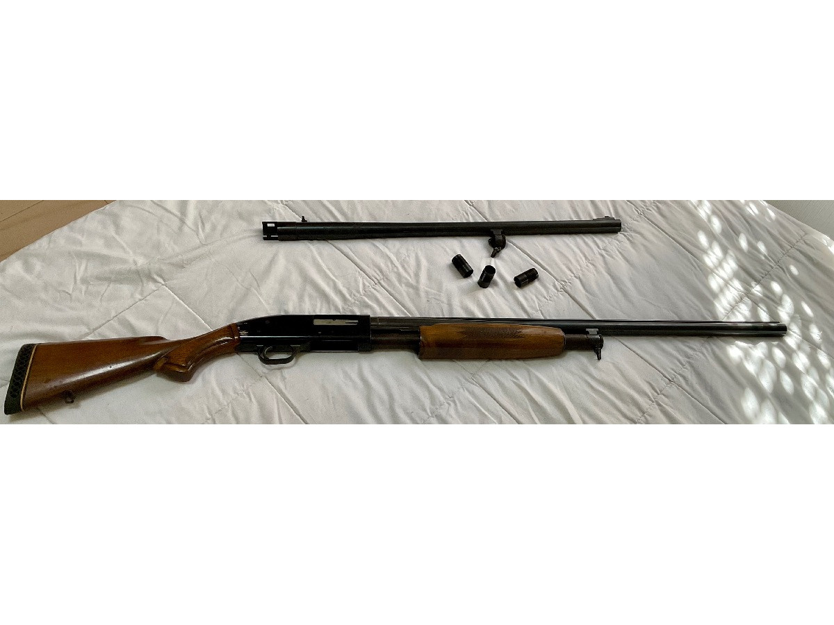 Escopeta calibre 12, de corredera de seis cartuchos en la recámara, marca Mossberg. Con tres polichoques, más un cañón para cartuchos de bala. Funda incluida.