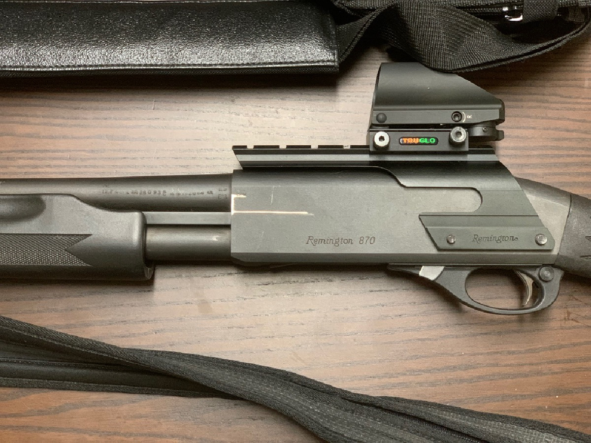 Escopeta corredera Remington en calibre 20. Escopeta de fibra con mira de punto rojo, funda de asalto tipo bandolera. Poco uso y bien conservada.