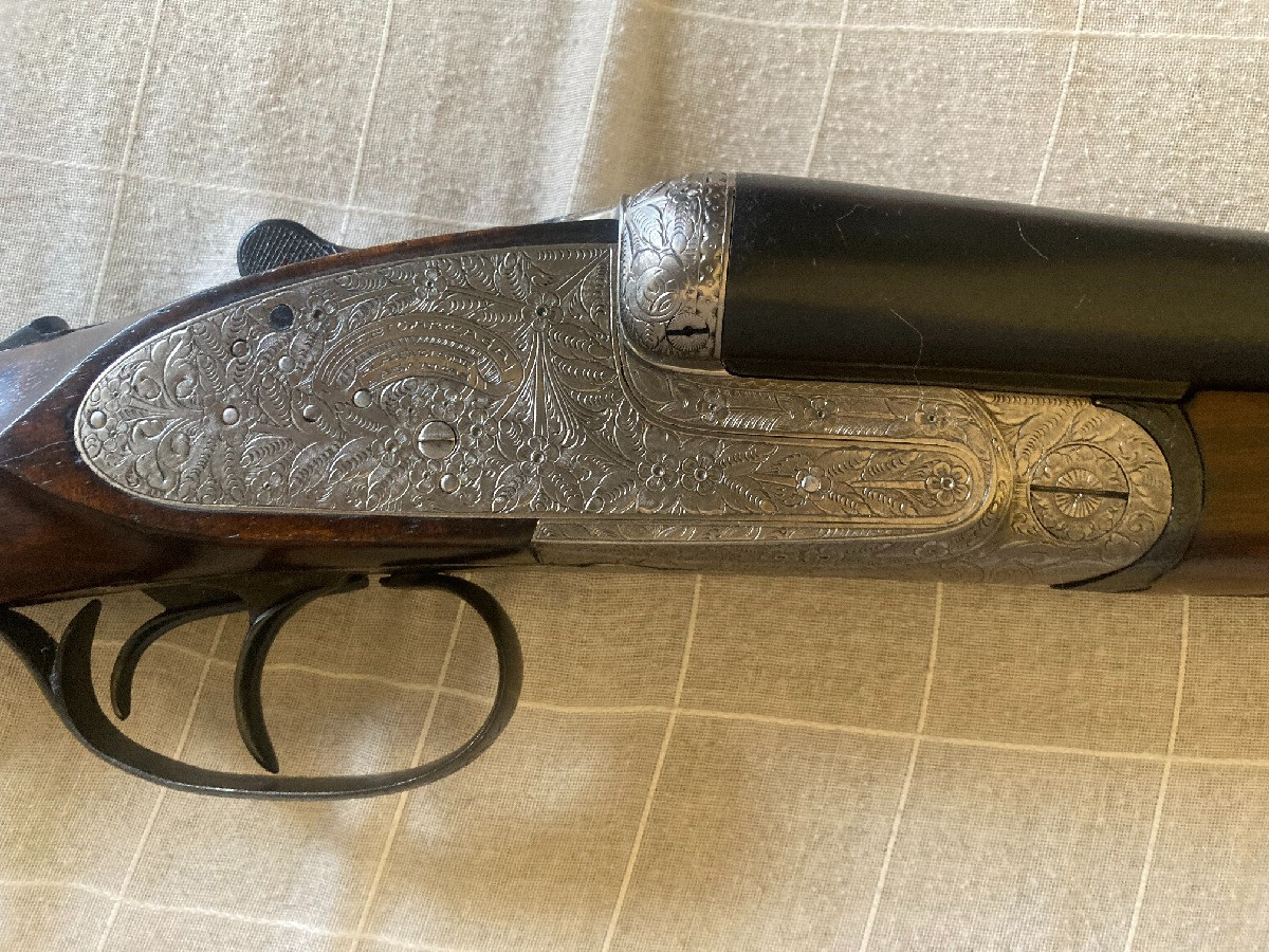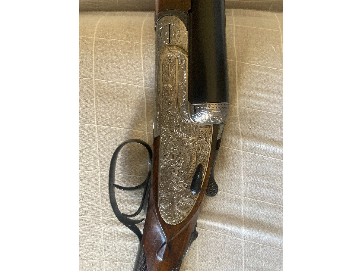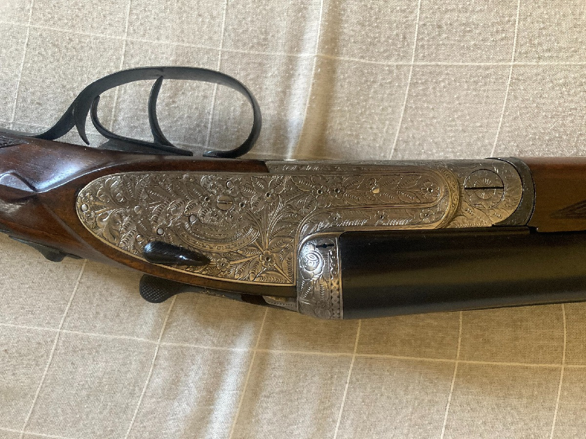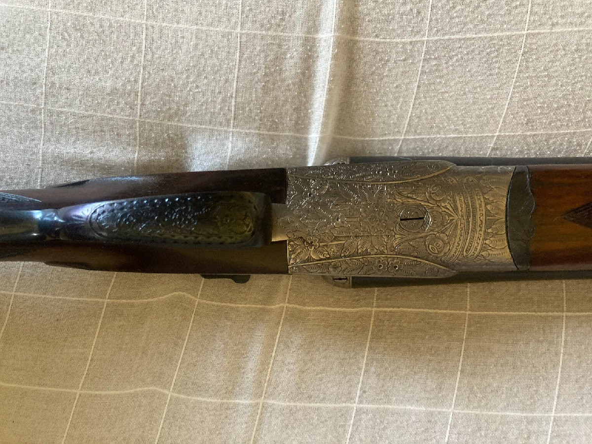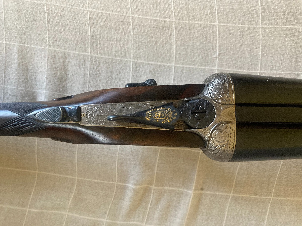 Escopeta paralela Eusebio Arizaga, calibre 12, expulsora, válvula de escape de gases, llave de desmontaje lateral, gatillo articulado, pletinas largas, cañón de 71 3* y 1*, recién pavonada y culata hecha al aceite, plomeo magnifico y en muy buen estado de conservación.