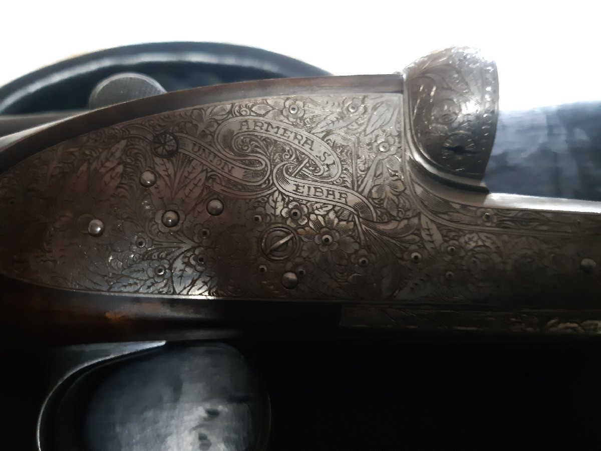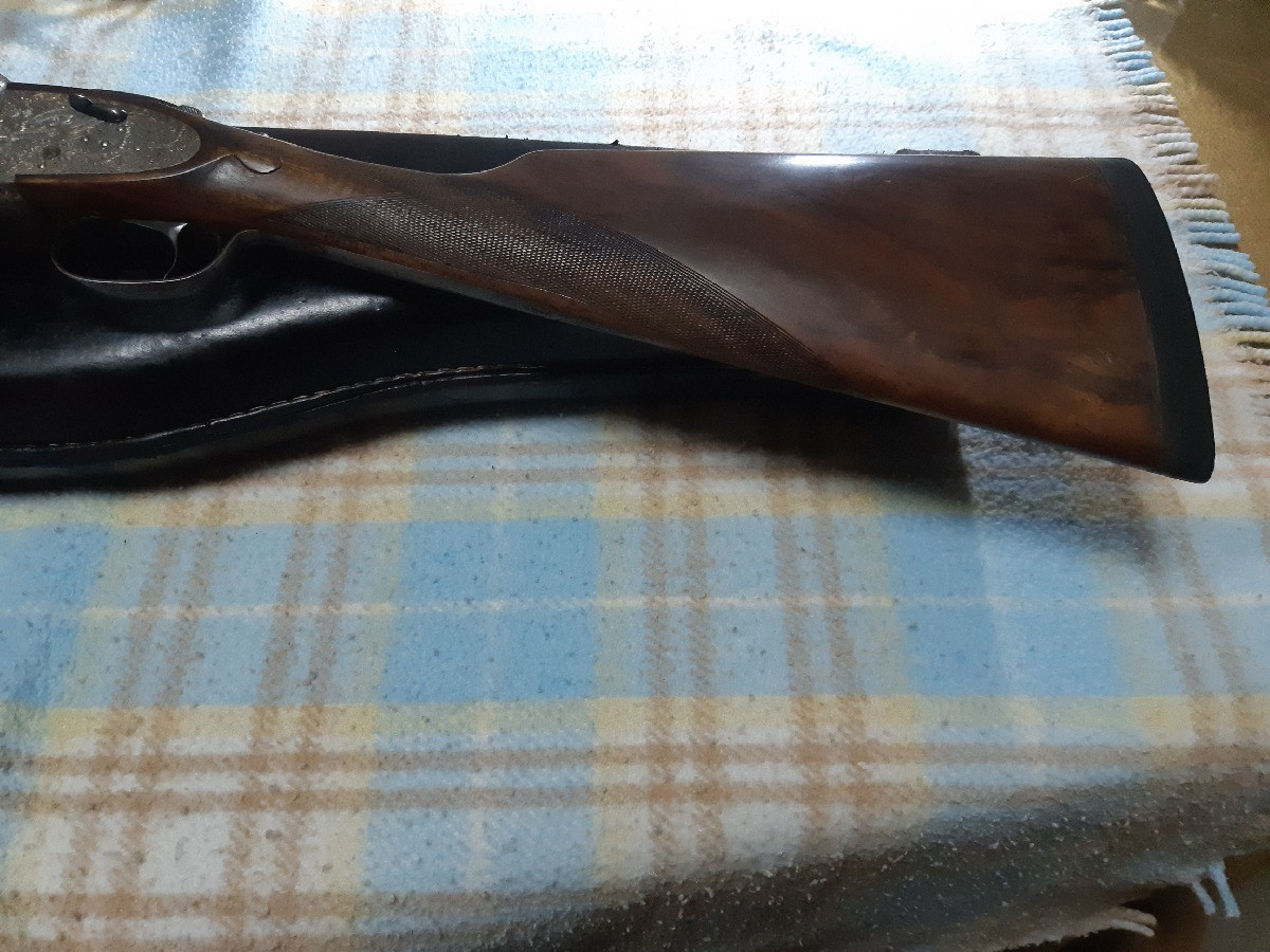 Se vende escopeta paralela Grulla 215, monogatillo, tres y una estrella. En perfectísimo estado, expulsores automáticos, culata raíz de nogal hecha por encargo, plomeo espectacular, grabados arabescos, báscula redonda.