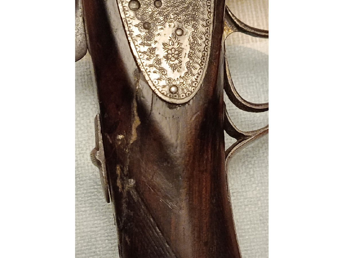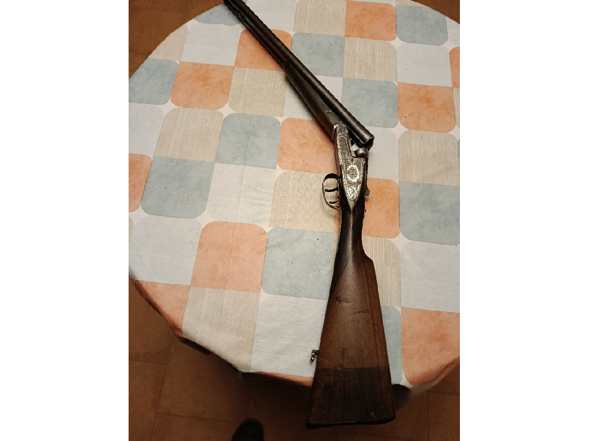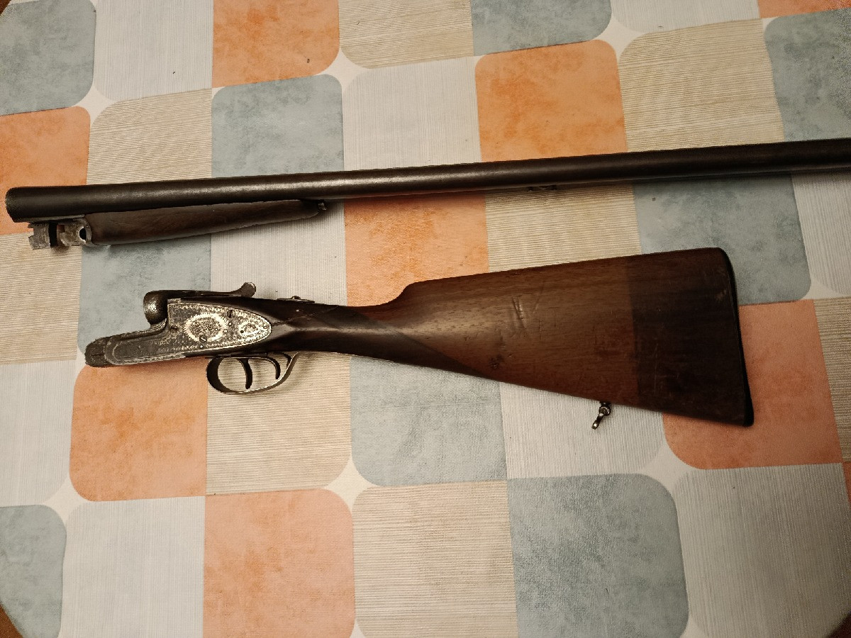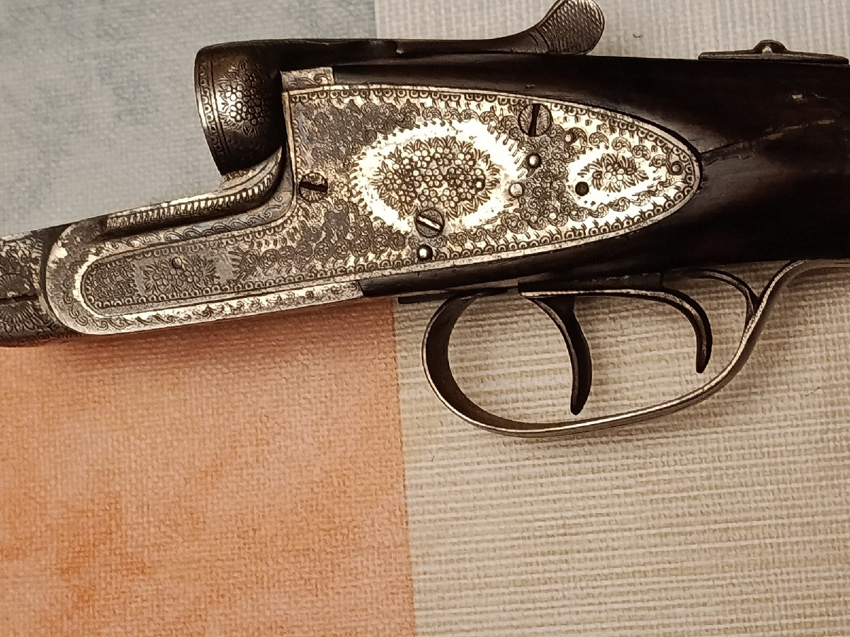Escopeta paralela Trust, cañón de 1 y 3 estrellas, culata inglesa con grabados muy bonitos. Calibre 12. Tiene una raja a cada lado del cuello de la culata reparada.