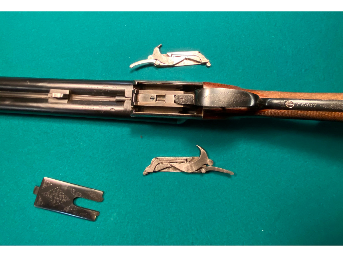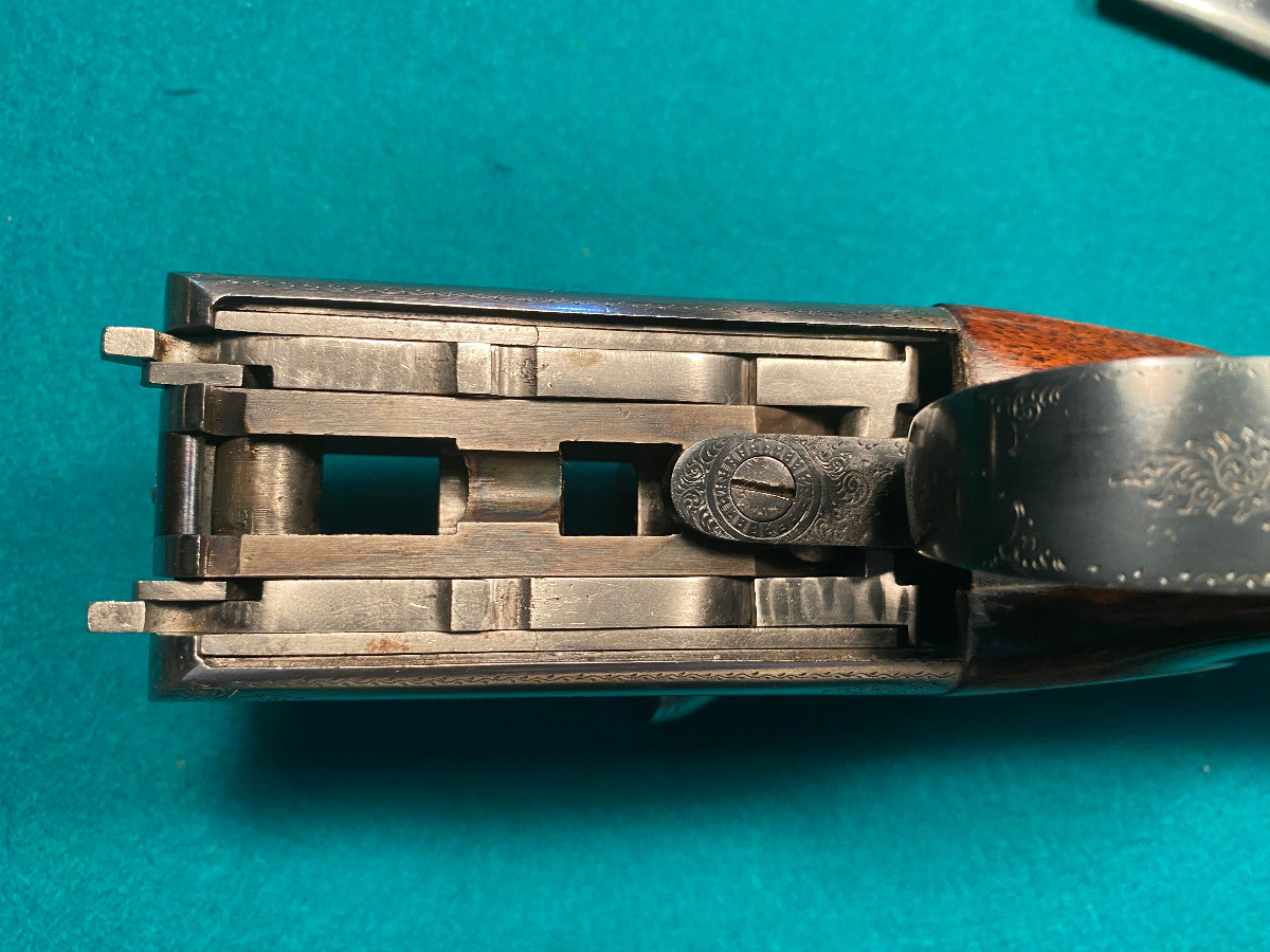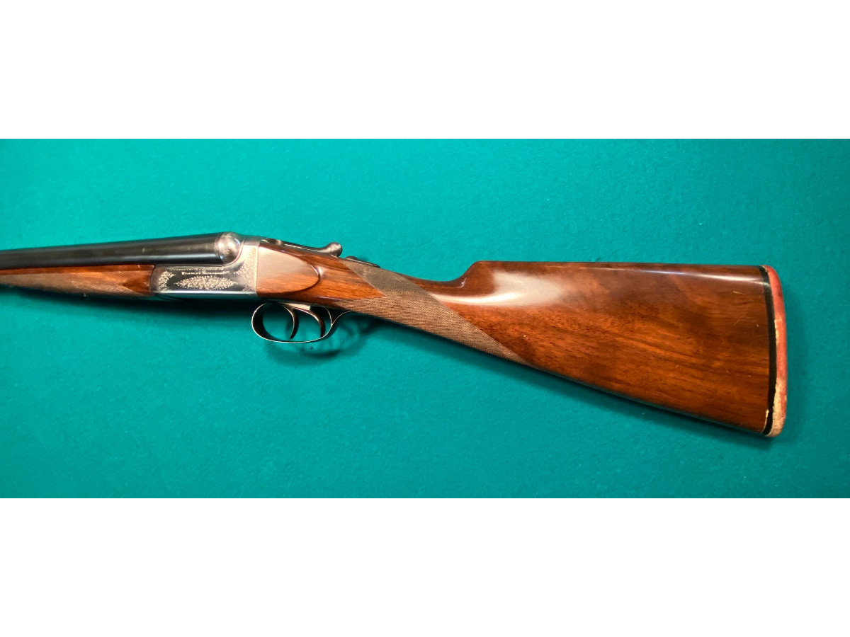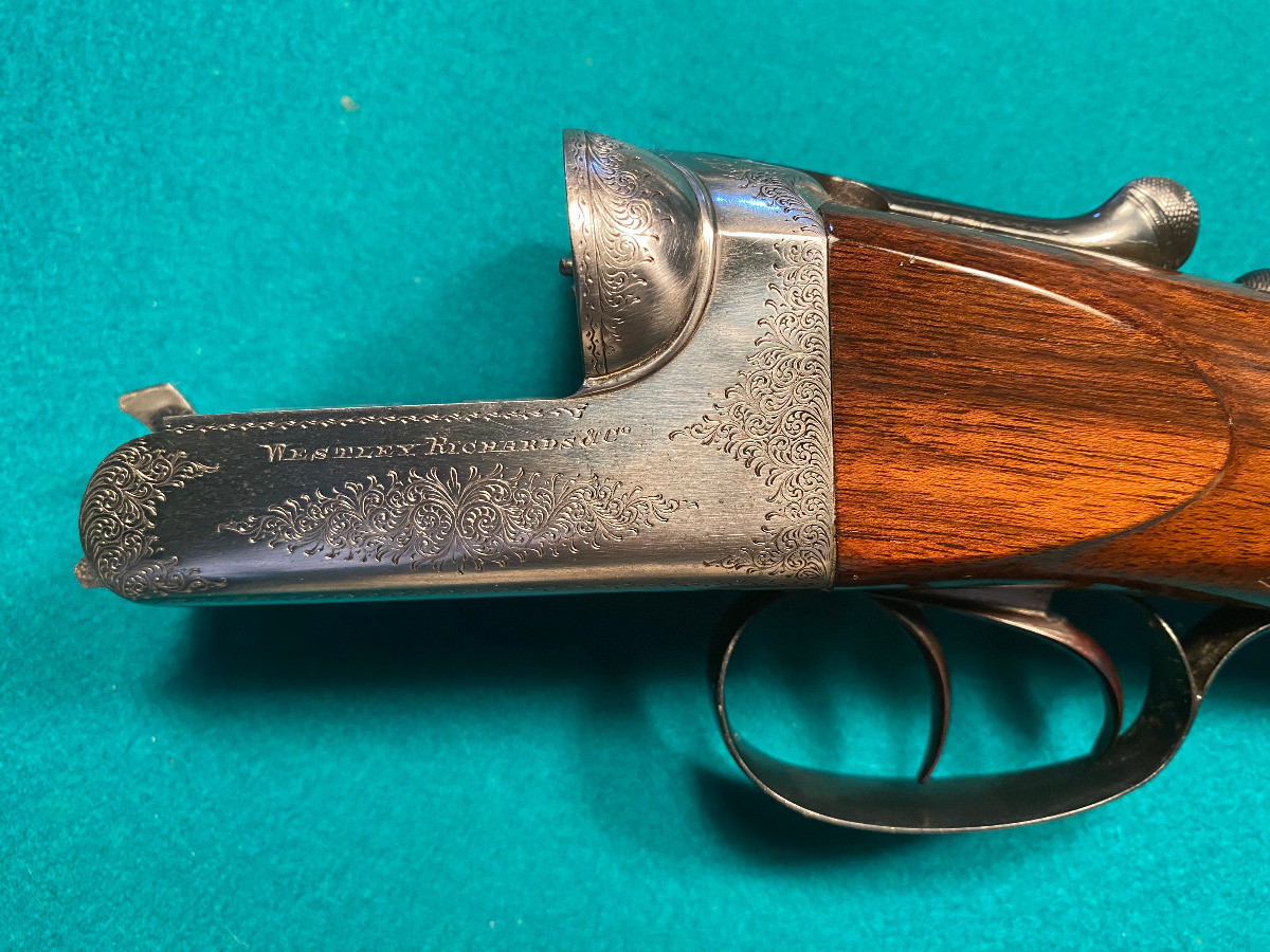 Escopeta de pichón paralela marca Westley Richards Droplock (boxlock con mecanismo desmontable a mano). Culata y guardamano nuevos. Escopeta clásica de mediados del siglo XX.