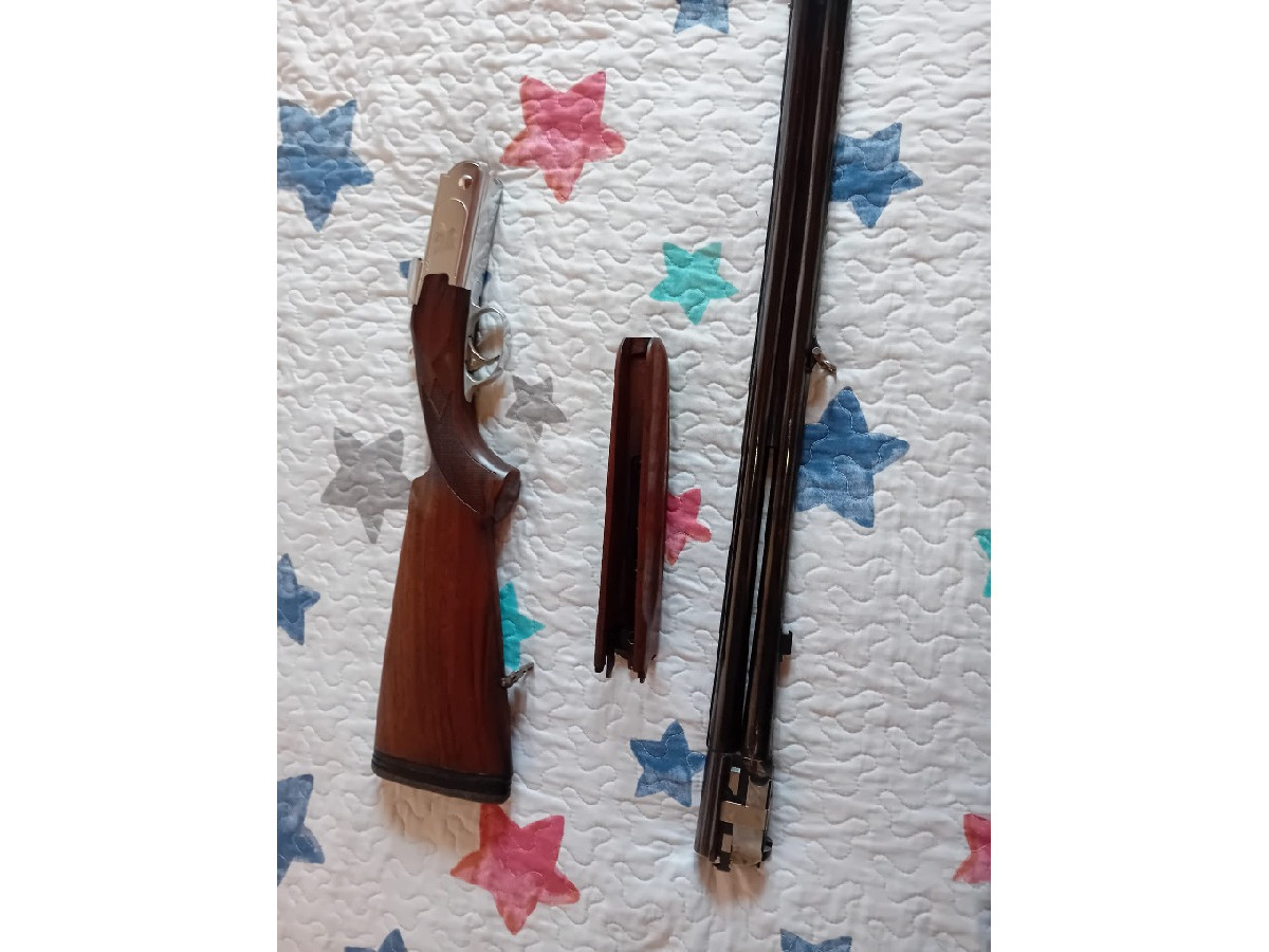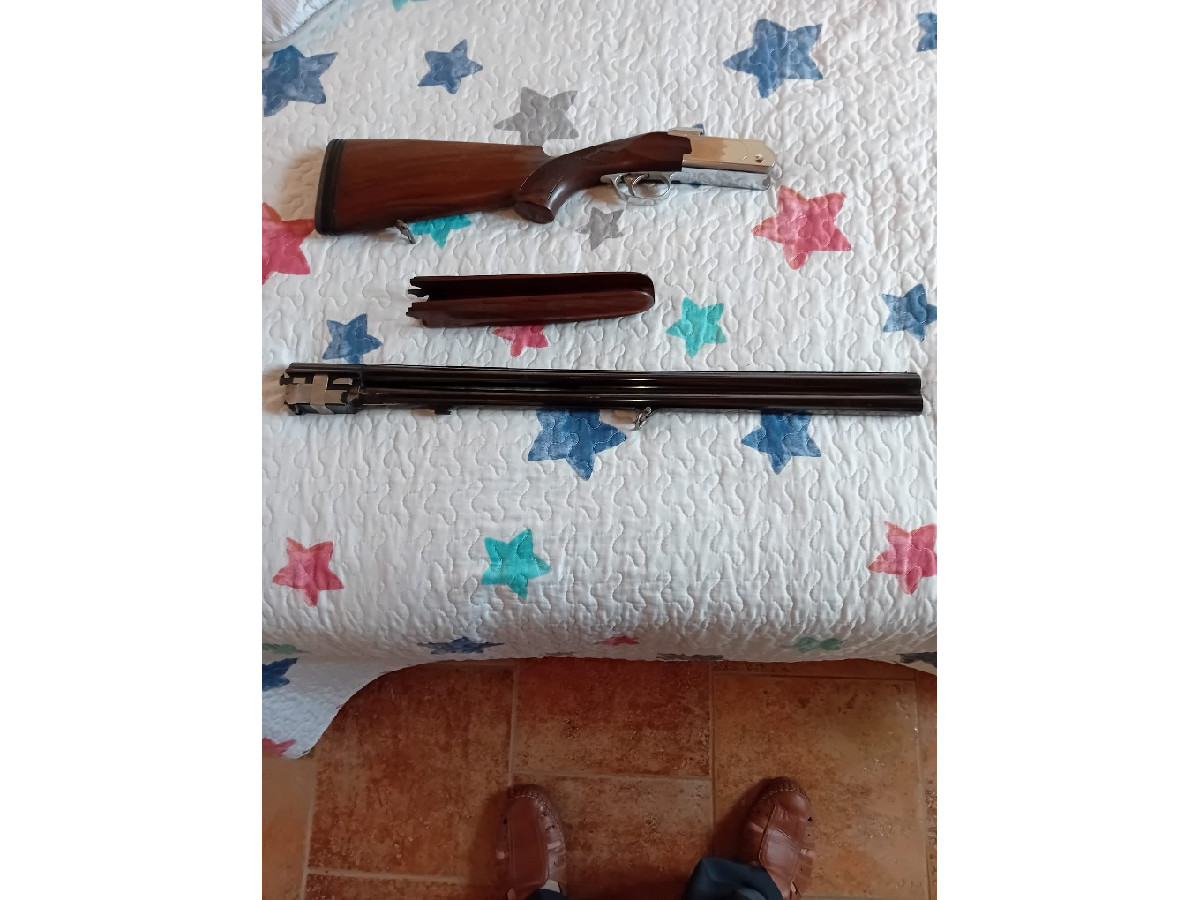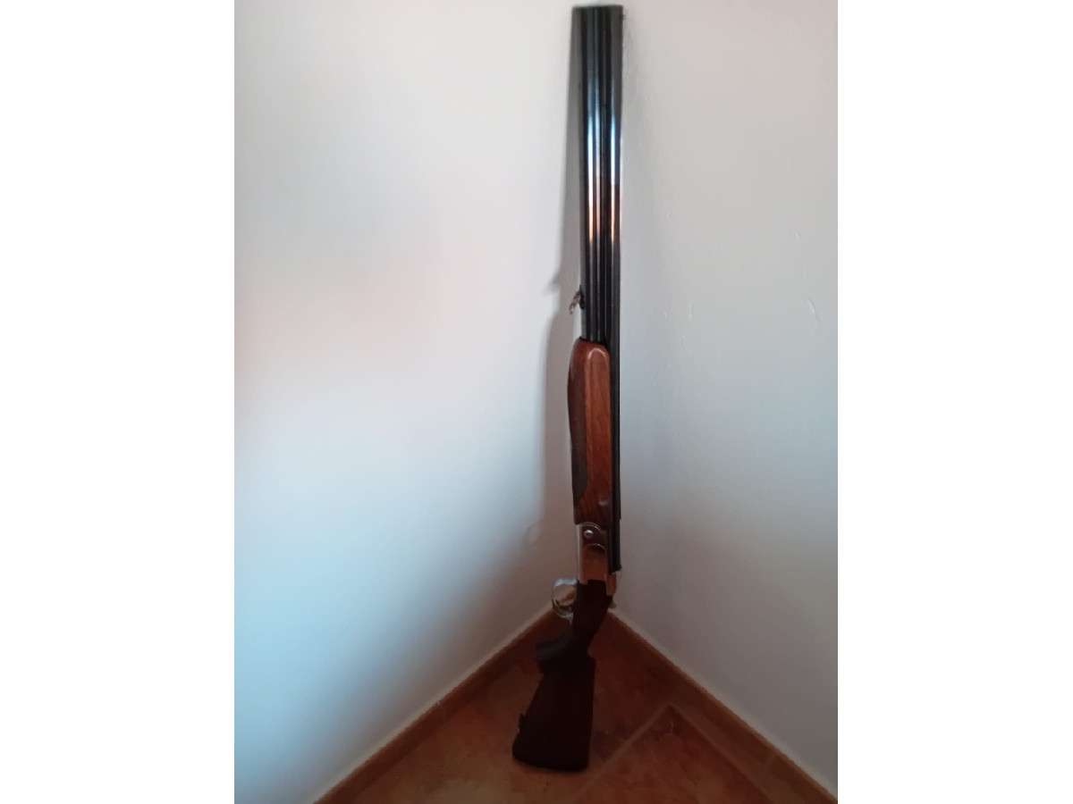 Escopeta superpuesta, cañones semiventilados, expulsadora de cartuchos, selector de tiro, polichokes de 2, 4 y 5 estrellas. Marca Marochi Finn Classic, estado de conservación nueva.