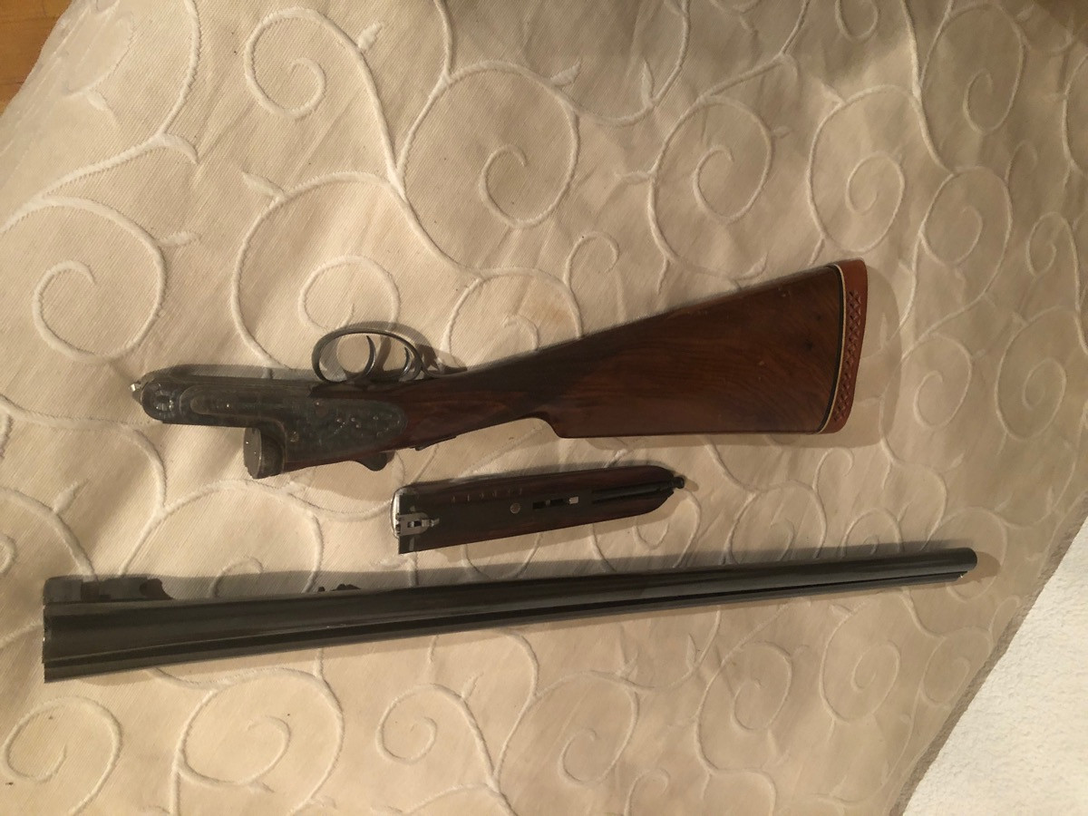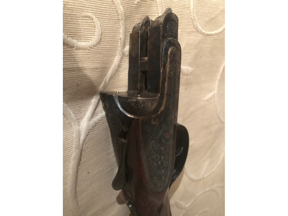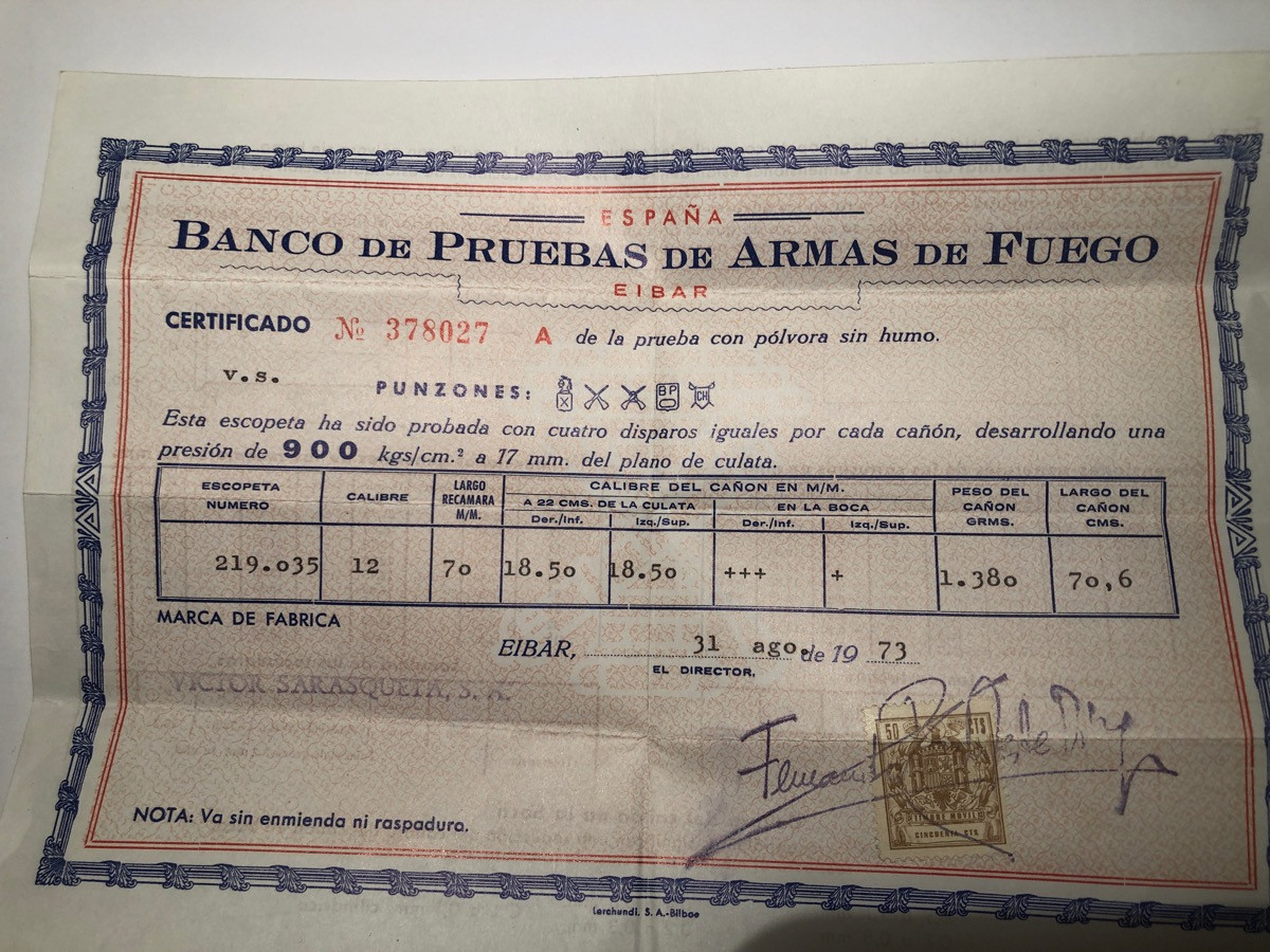 Escopeta Víctor Sarasqueta. Modelo DW exp. Escopeta de calibre 12-70, con expulsores automáticos, cañones yuxtapuestos, de 70,6 cm de largo, choques de 3 y 1 *, probada en Banco de Pruebas de Armas de Fuego de Eibar, desarrollando una presión de 900 kg/cm², calificada con cinco punzones. Fabricada en 1973. En muy buen estado de conservación, muy poco usada. Muy adecuada para caza en mano y tiradas de palomas o patos.
