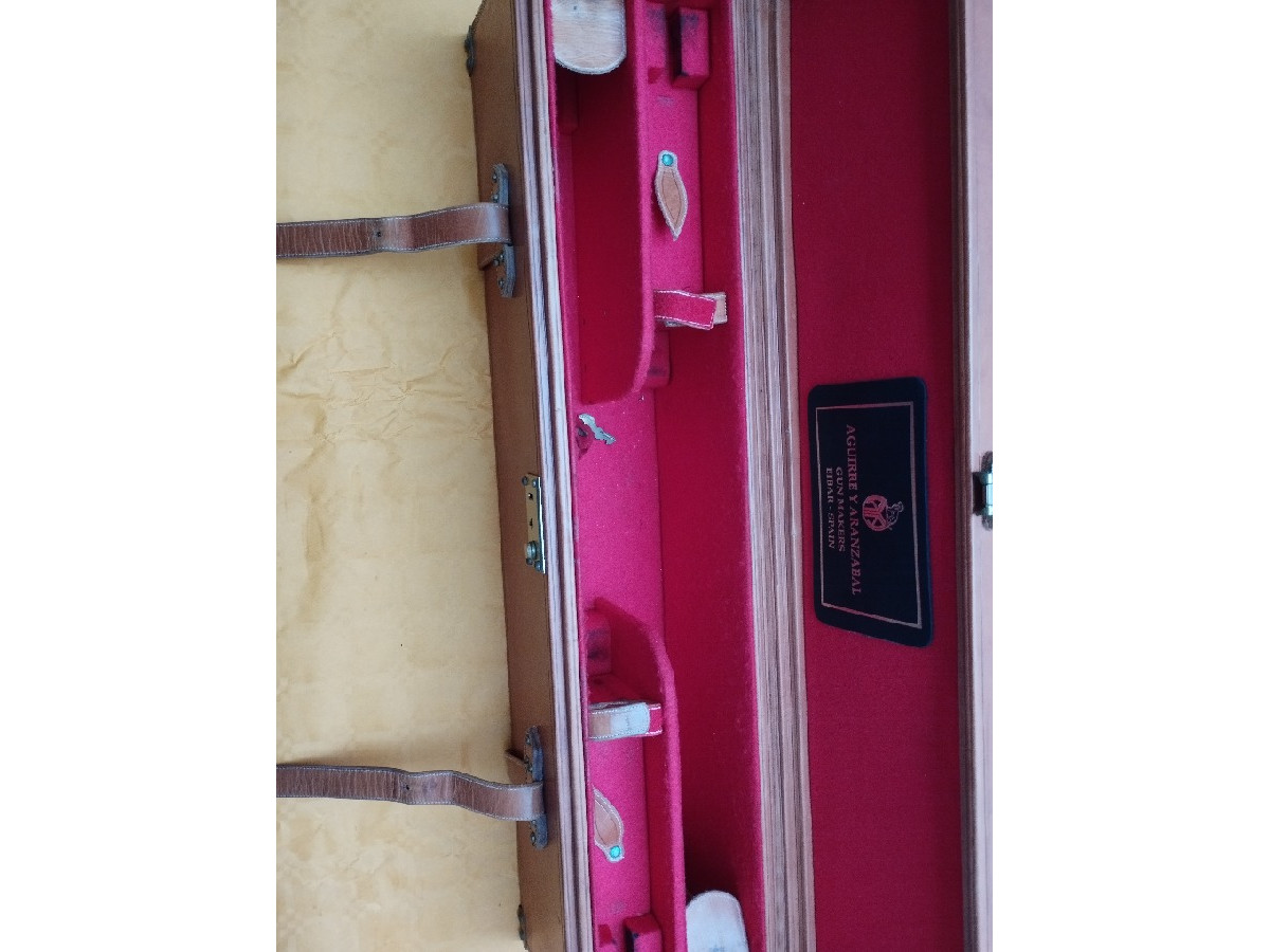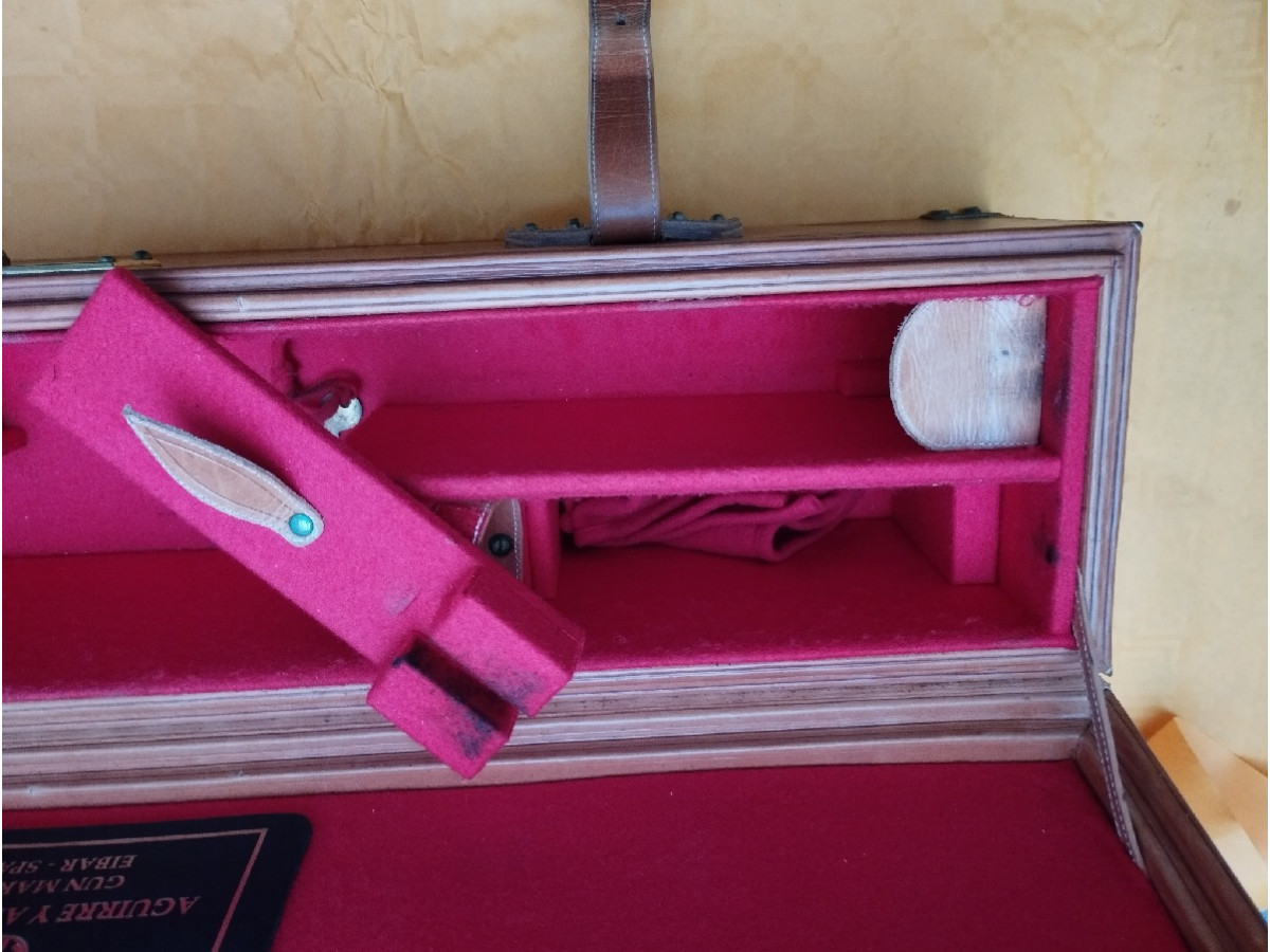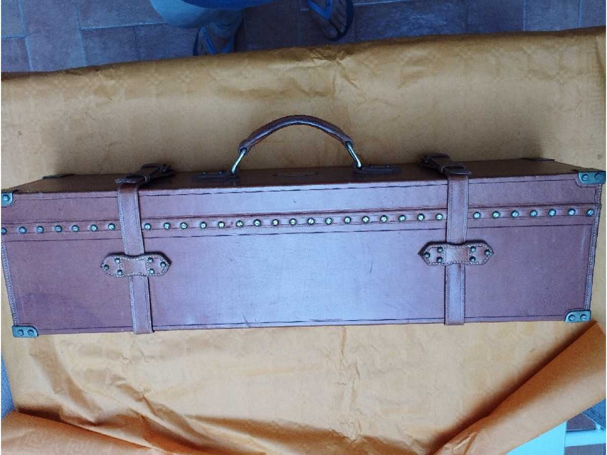 Estuche de cuero con herrajes de latón, forrado en fieltro rojo, para pareja de escopetas paralelas de 71 cm de cañón.