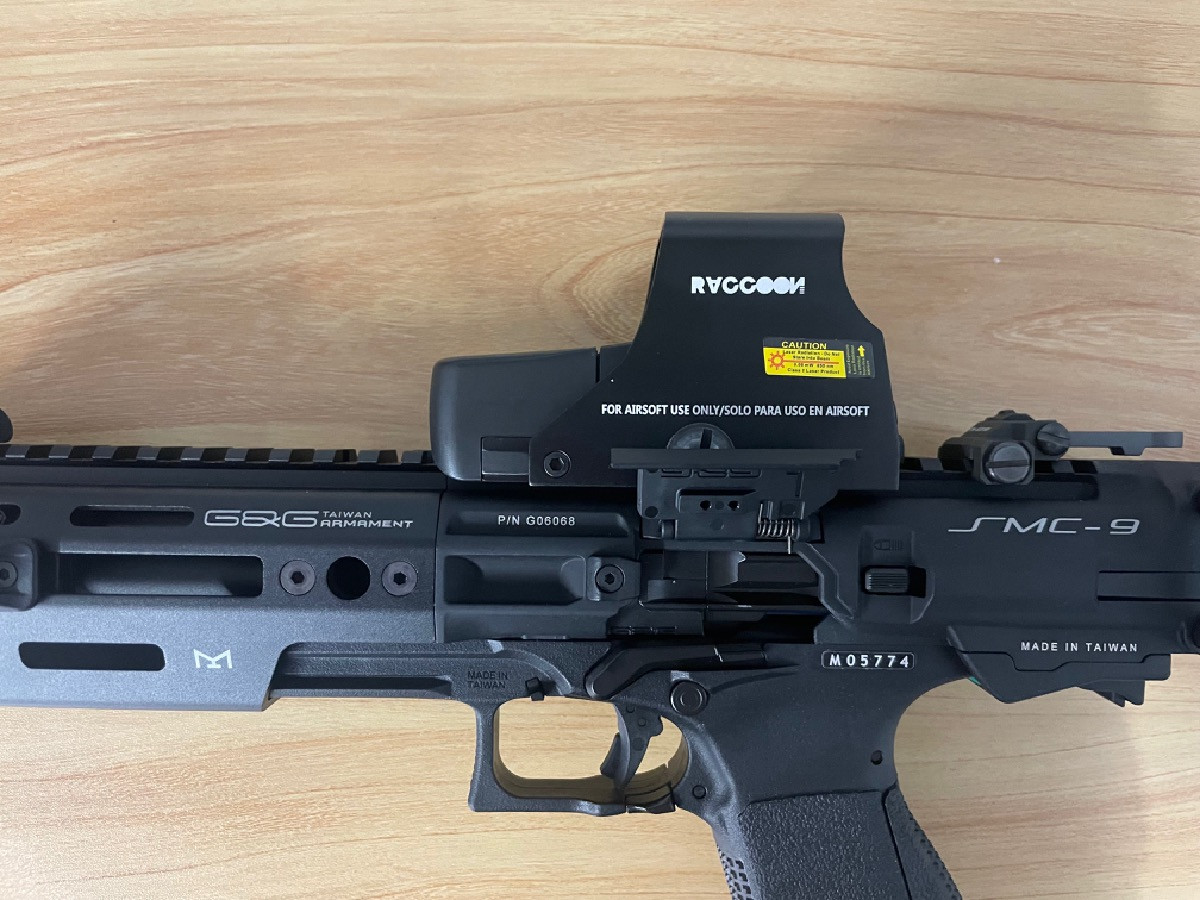 Incluye un red dot Raccoon y un silenciador metálico simple