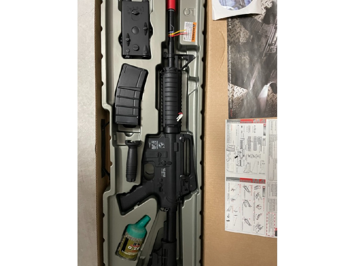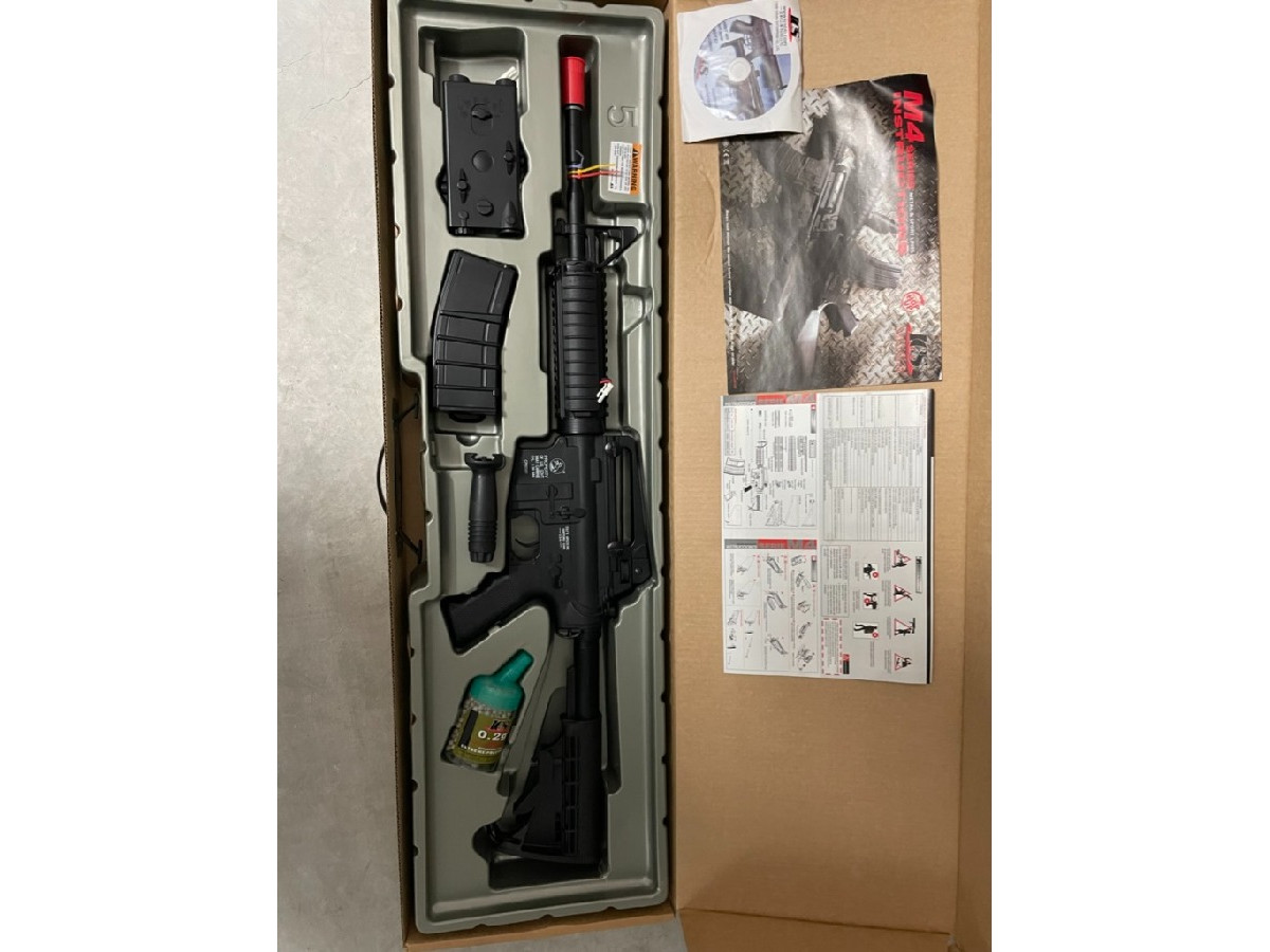 Contenido de la caja: M4 R.I.S., 2 cargadores Canadian C7 300 BBs, 1000 BBs, caja para baterÃa AN/PEQ2, grip táctico, varilla limpiadora y manual