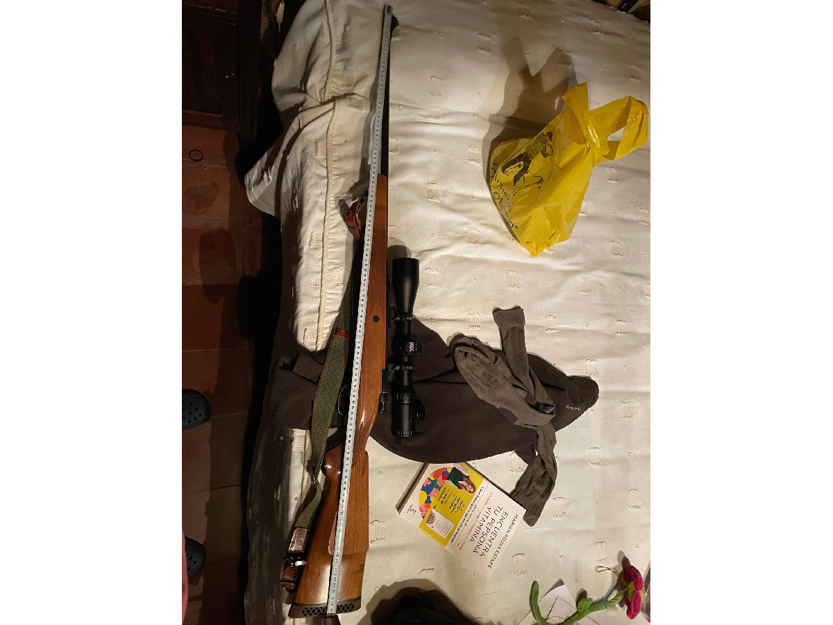 Rifle Mauser calibre 308 y visor shilba 2,5-15x50 con acople Pard 007SP, es Cañón largo y madera, incluye cajón de cuero con esponja y porta rifle.