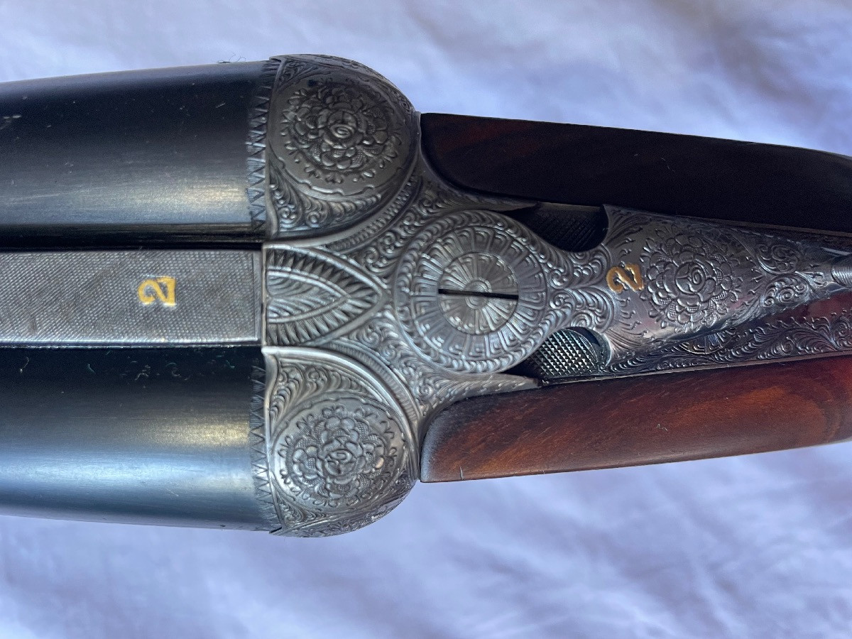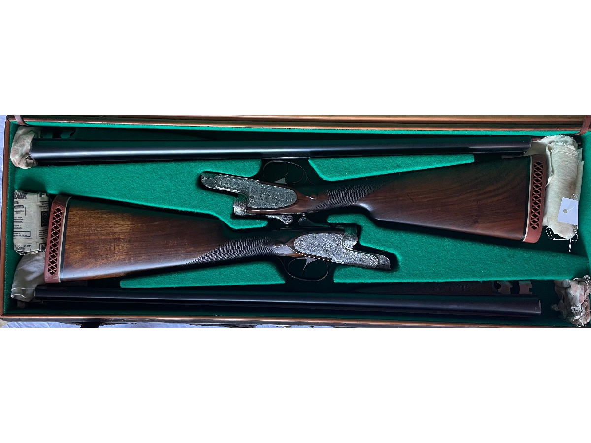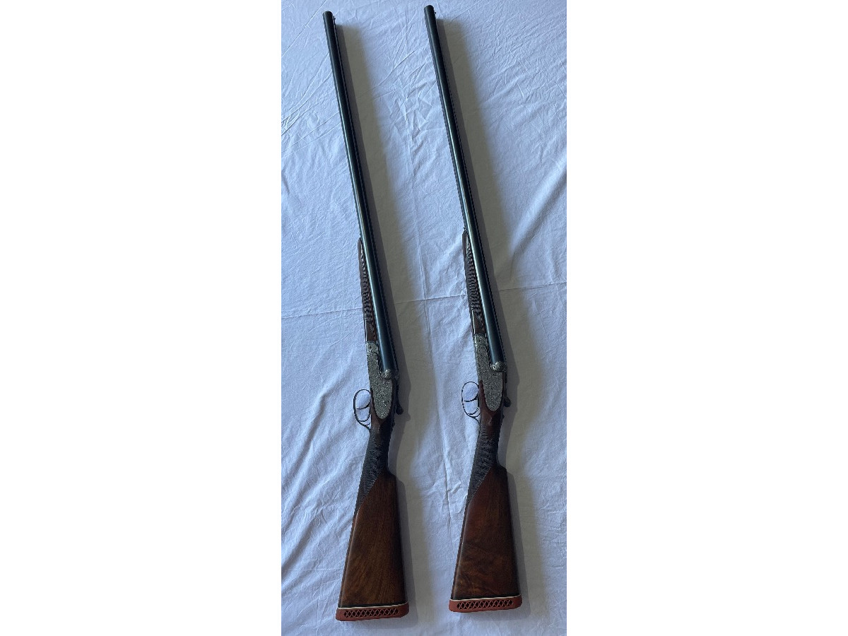 Pareja de paralelas AYA, creo que es el modelo 56. A una de ellas se le encargaron los caños un poco más cerrados ya que se usaban para los ojeos de perdices y para conejos en zonas sucias, como escobas. Mejor verlas. Valoradas en dos armerÃas entre 4500 y 5000€.