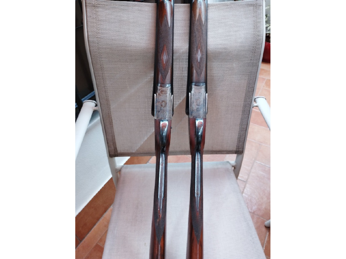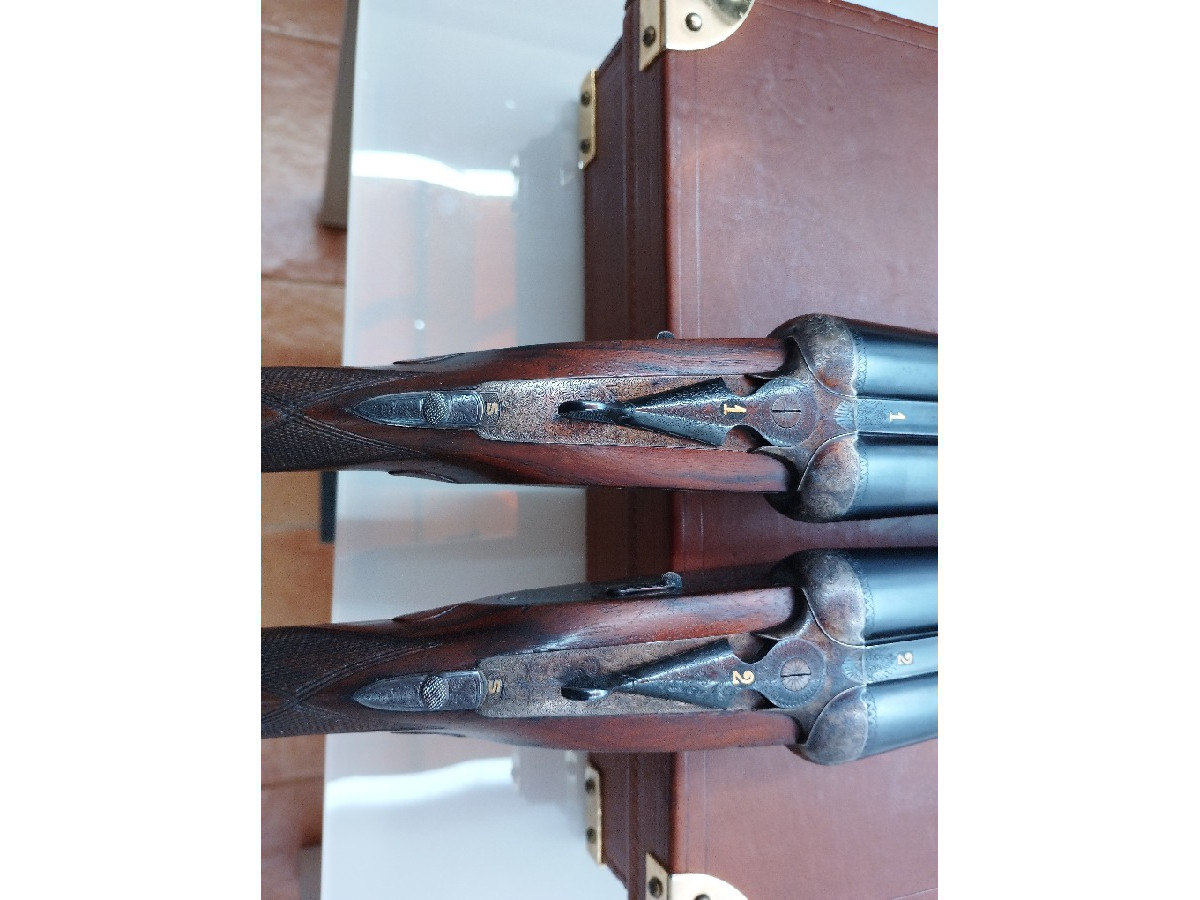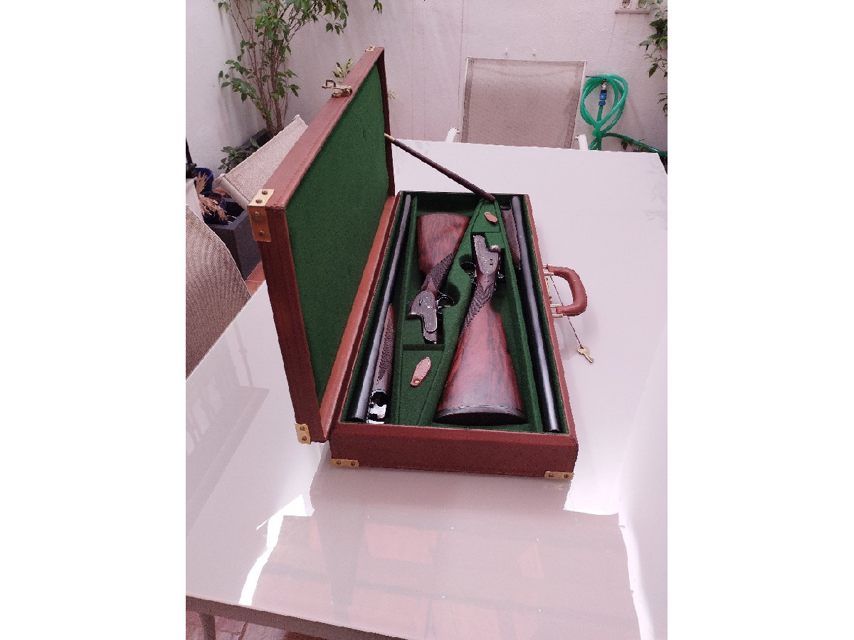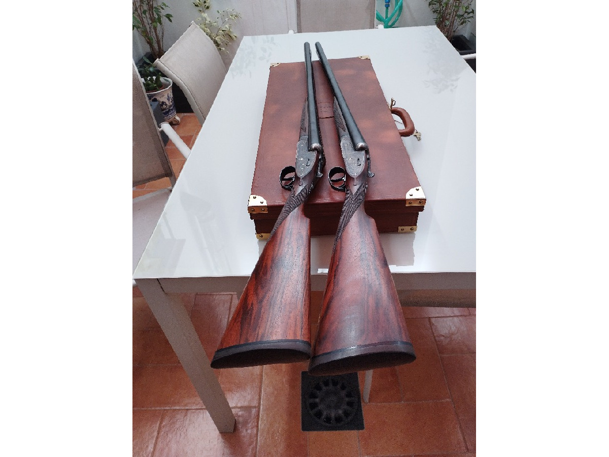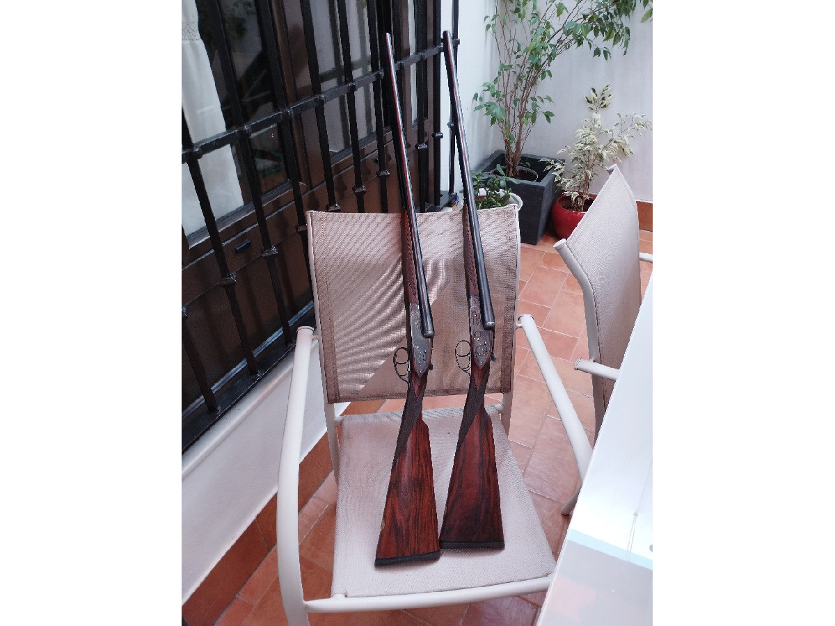Pareja de escopetas de ojeo Pedro Arrizabalaga, largo de cañones 71 cm, chokes **** y ***, largo de culata 37 cm aprox. Apertura automática, válvula de gases, gatillo articulado. Grabados muy finos tipo Purdey. Se entregan en su estuche de cuero.
