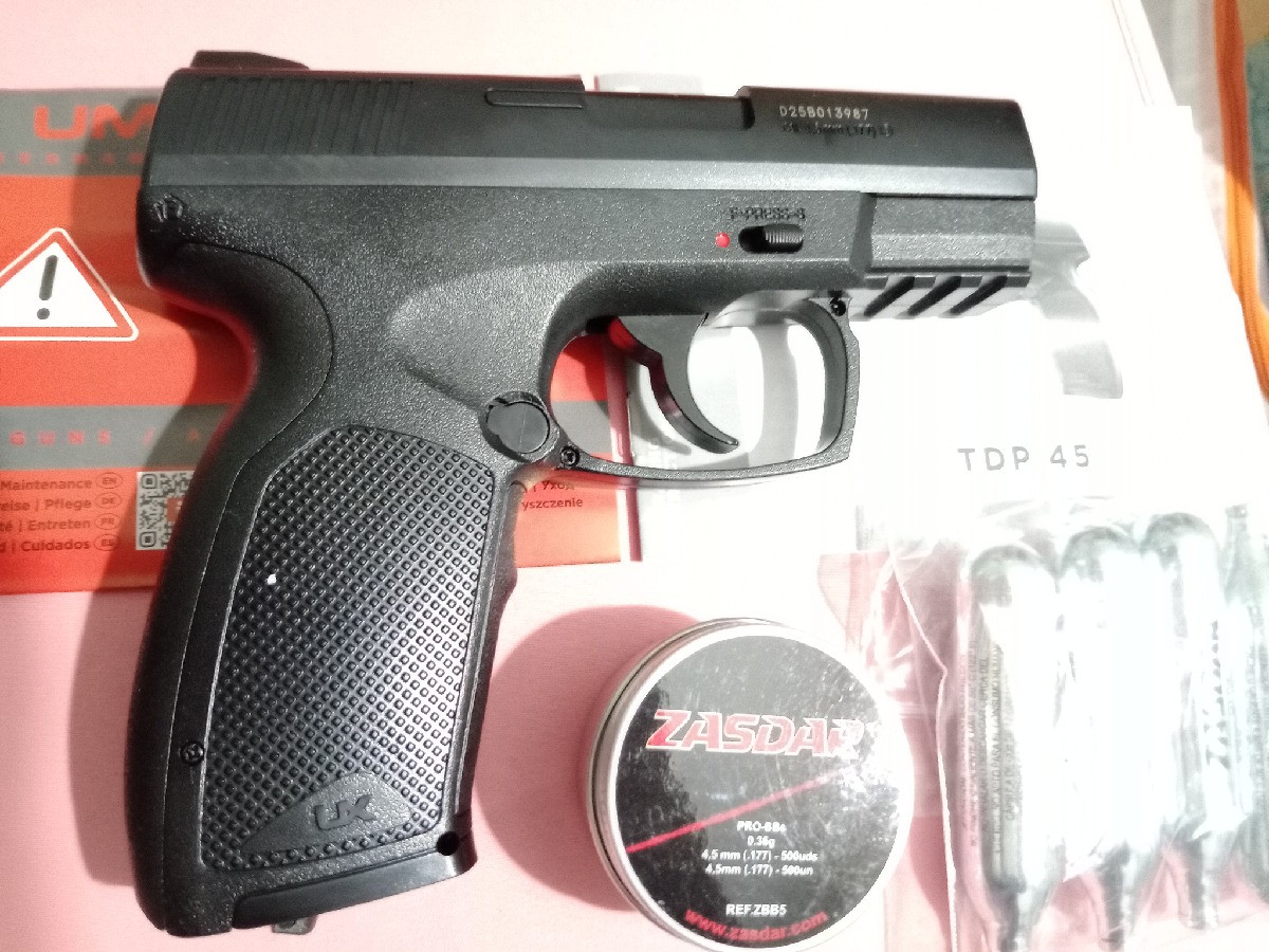 Pistola CO2 Umarex TDP45, se ha gastado menos de una botella de CO2, nueva, se entrega con caja instrucciones, 4 bombonas de CO2 y caja de balines de acero. Calibre 4,5 acero. Cañón de acero. Cargador metálico de 19 tiros. Semiautomática. Carril Picatinny. Bombonas de 12g.