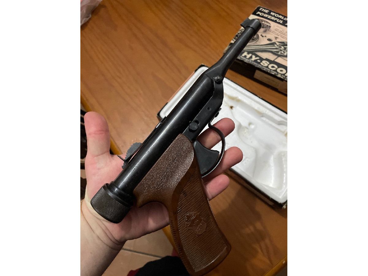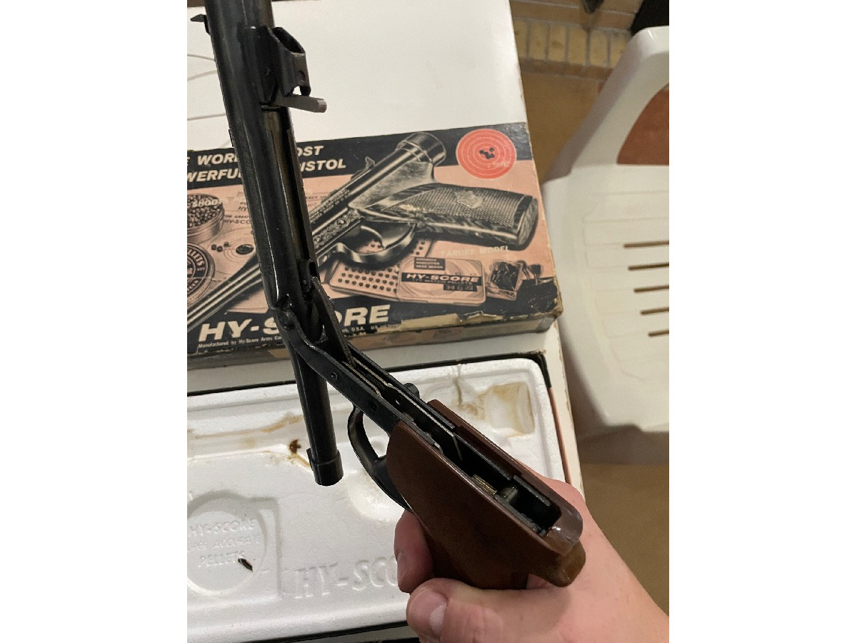Esta pistola es una Hy-Score modelo 800 calibre 4.5 o .177. Pistola importada de Estados Unidos de la década de los 50, en su caja original, funcional y en muy buen estado para su edad y sin óxidos (prácticamente no tiene uso). Seguramente pieza única en España. Una pieza de colección.