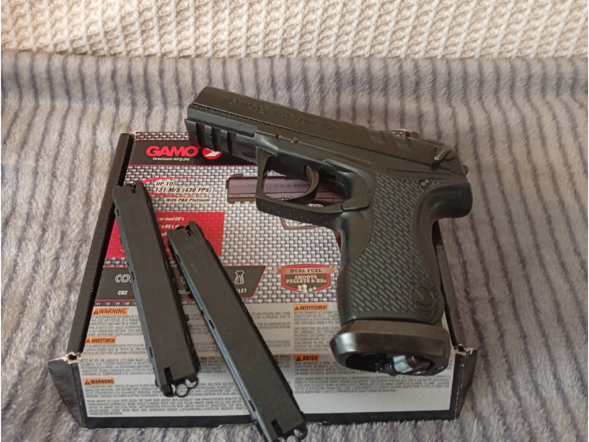 Pistola semiautomática de CO2. Se ofrece con 2 cargadores extras. Corredera, gatillo, palanca de seguro y martillo metálicos. Dispara perdigones o bolas de 4,5. Capacidad de cargador: 2 tambores de 8 balines. Cañón estriado, en caso de usar bolas, se aconseja usar de plomo, no bbs de acero. Velocidad inicial de salida: 130 m/s.