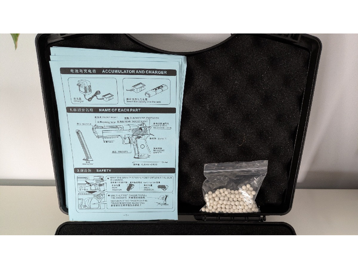 Pistola para airsoft completa con todos los accesorios. - Incluye manual, batería, un cargador, un adaptador de corriente y una bolsa de bolas de 0,20 g. - Maletín incluido en el precio - Velocidad de disparo 200 FPS - Se ha usado en el interior de casa.