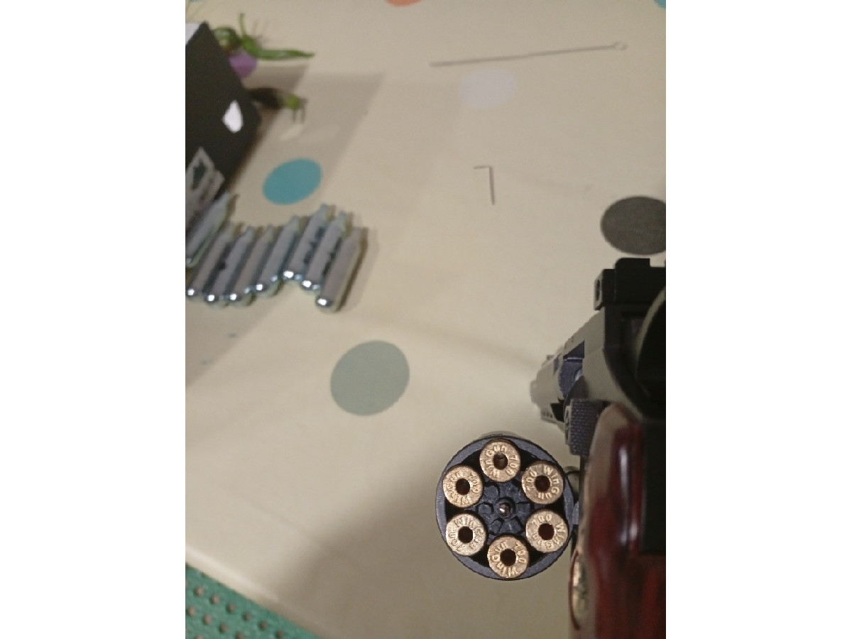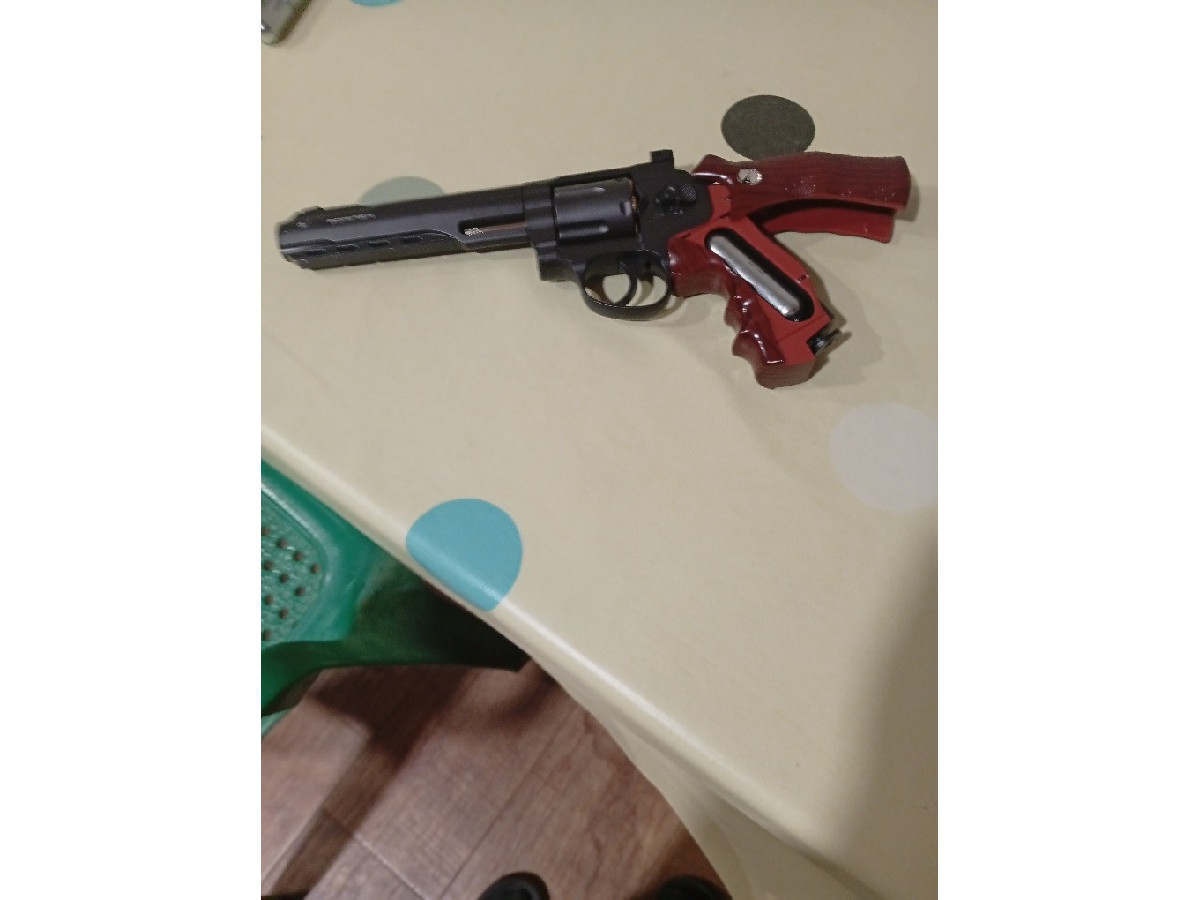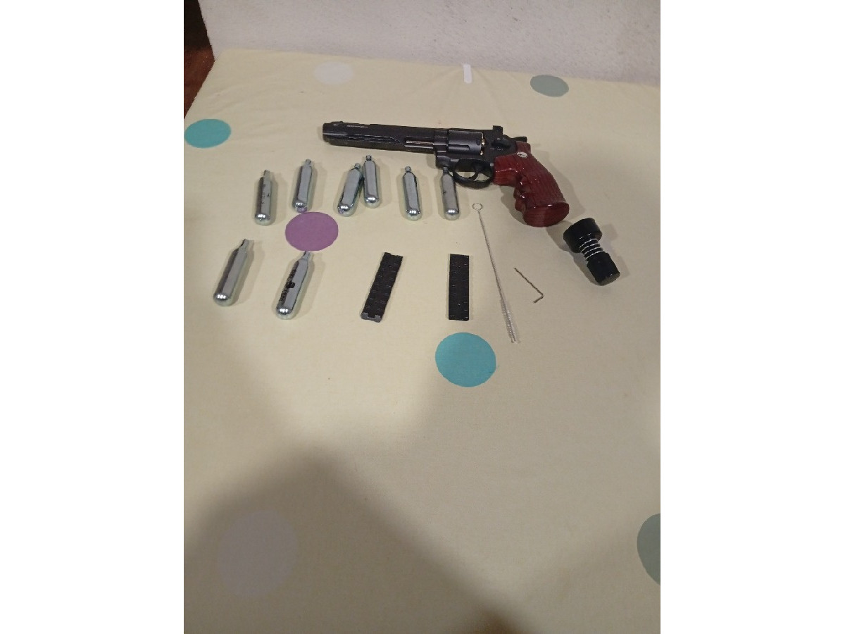 Es un revólver de aire comprimido que está nuevo. Tiene dos bases para ponerle linterna y visor, 8 bombonas de gas que necesita, un limpiador para 5 vainas de balas que también las trae, su llave para regular el tiro y 500 bolas de acero.