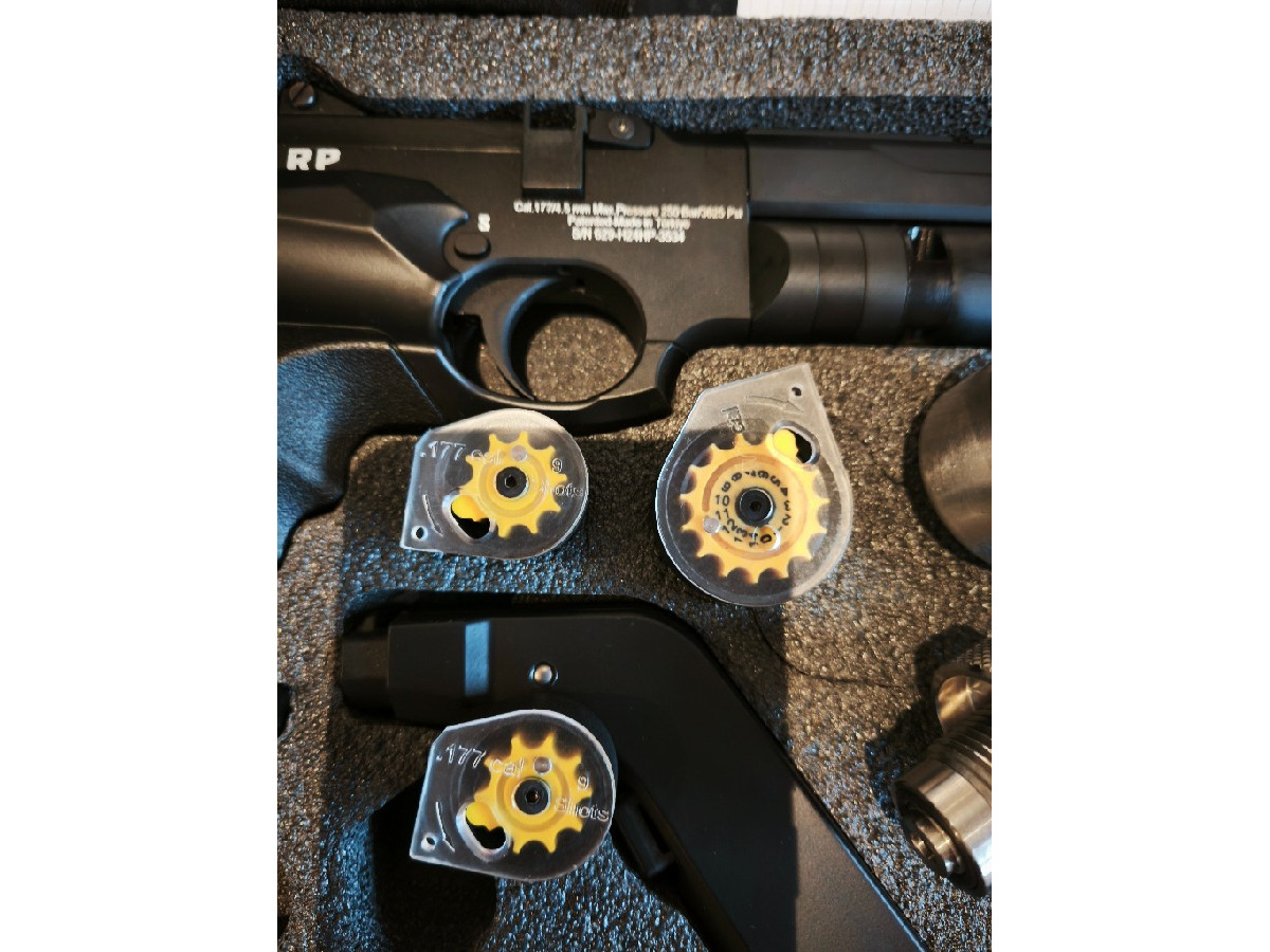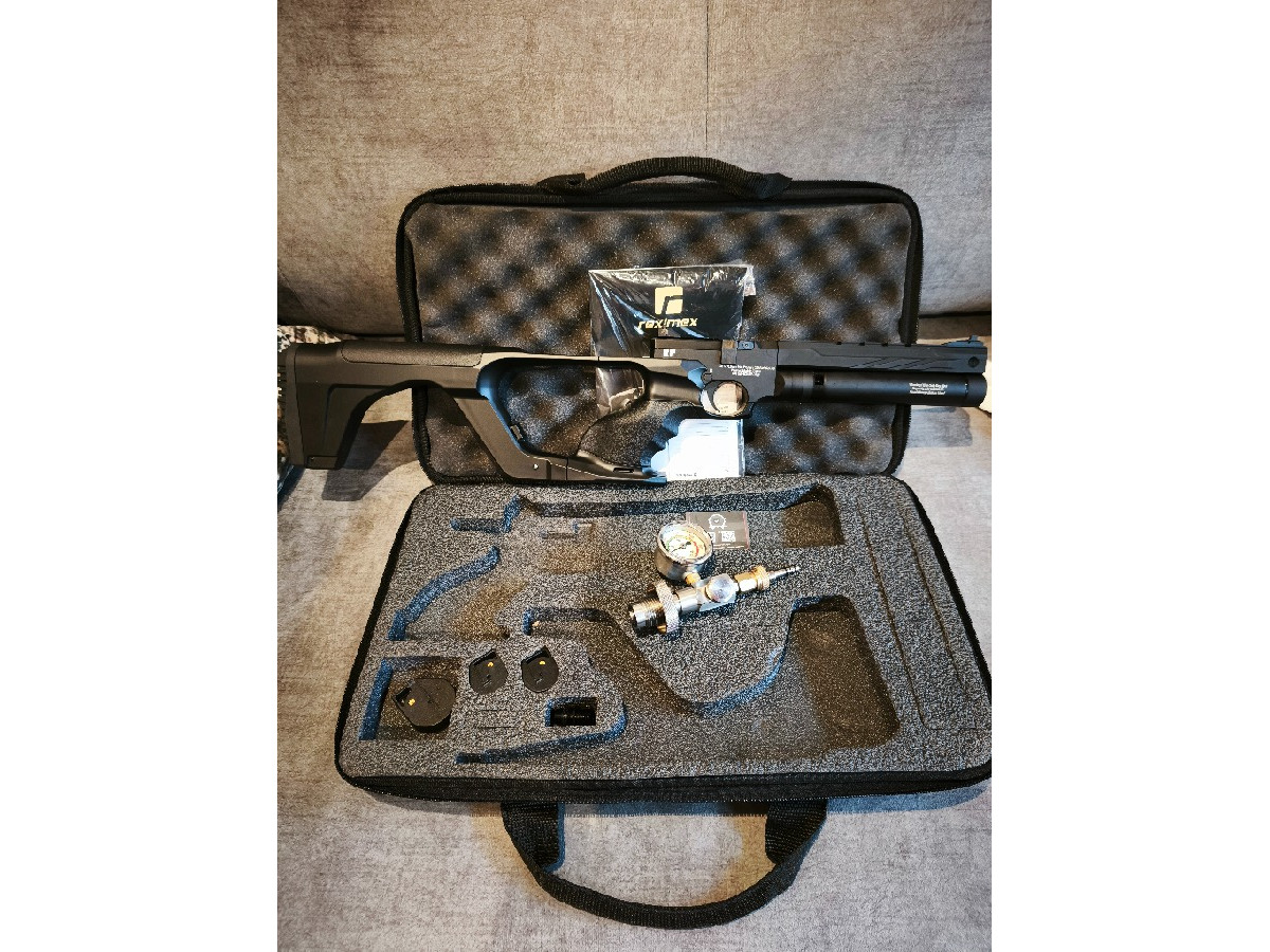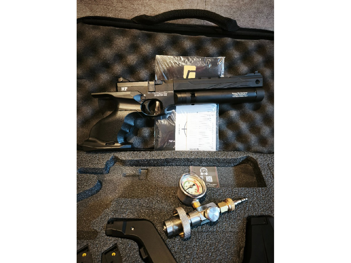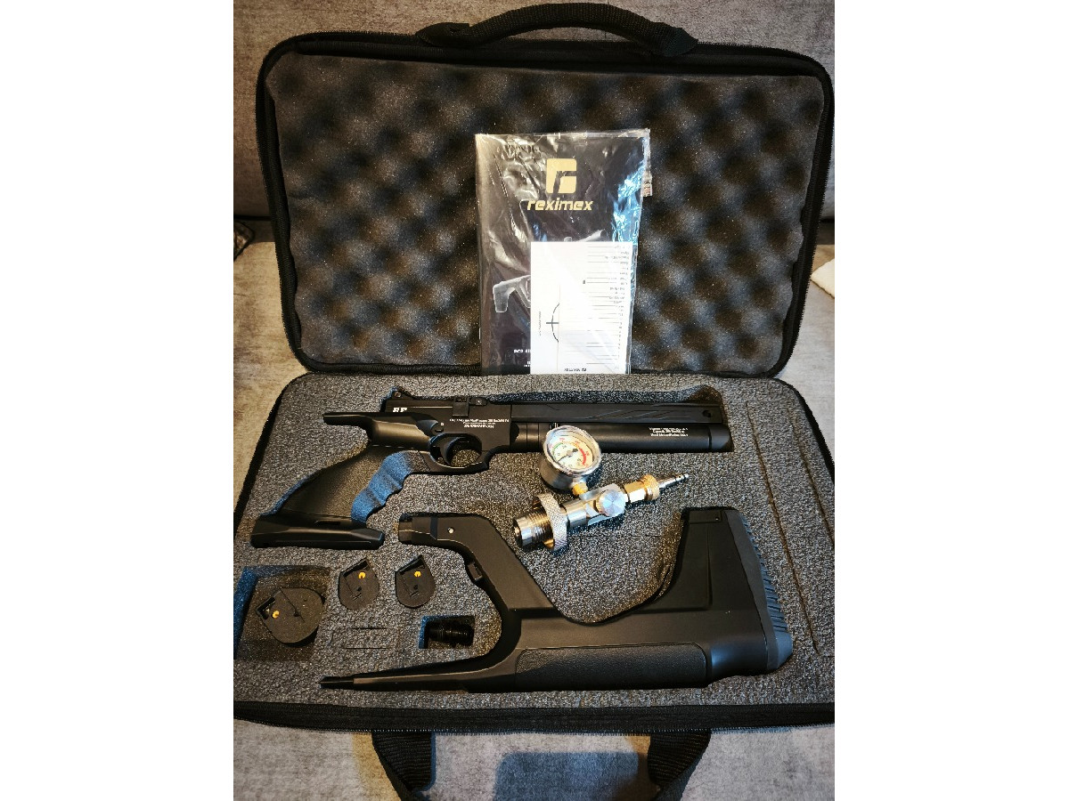 Pistola REXIMEX RP PCP 4,5 10 julios. Los desarrolladores turcos de Reximex han diseñado esta fantástica pistola RP PCP, un modelo de altas prestaciones diseñada con 10 julios para competición. Incluye sistema de cargador rotativo, culata desmontable en fibra, cantonera de goma y miras abiertas. Incluye depósito de 50cc y 250Bar de presión con regulador. Además, el gatillo es ajustable. Incorpora una Raíl 11 mm superior de tamaño mediano para equipar visor, láser o punto rojo.