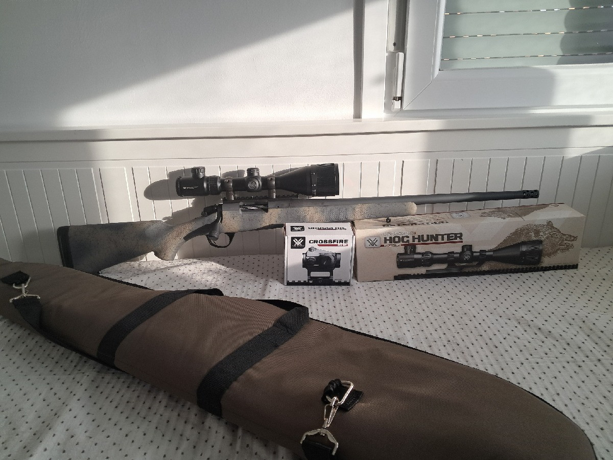 Rifle prácticamente nuevo. No se ha tirado ni una caja. Calibre 308. Visor Vortex Crossfire II + Red Dot Vortex + funda.