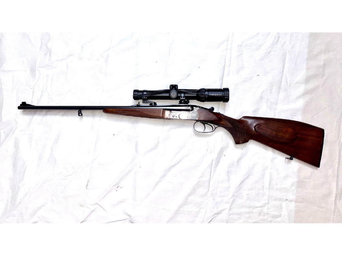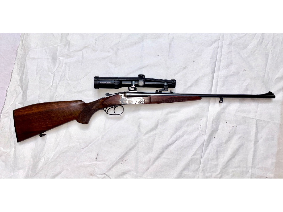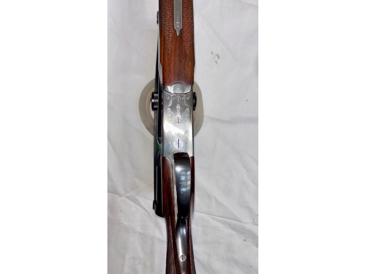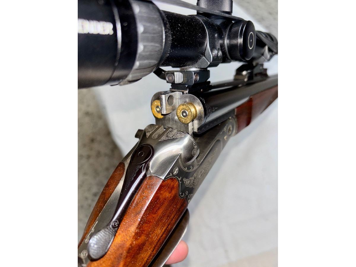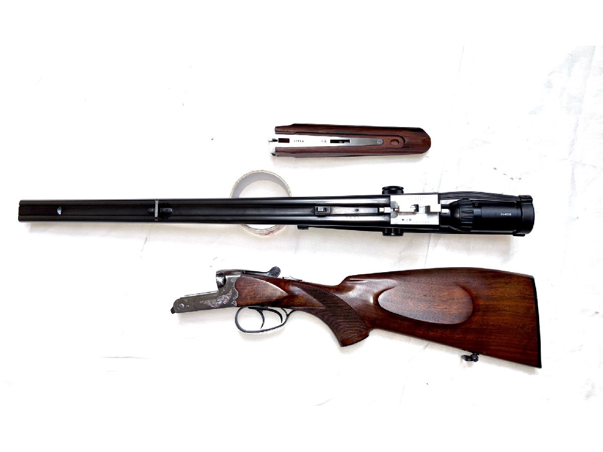 Grabados arabescos sobre bascula de media pletina, fabricado en madera de nogal seleccionado Grado IV y con carrillera tipo Safari, la culata dispone de cantonera anti retroceso y lomo de cerdo.