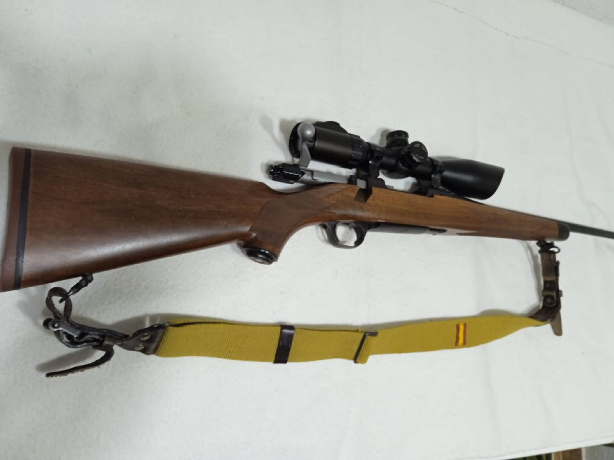 Ruger de cerrojo calibre .308, modelo M77 Hawkeye con anillas especiales de 30, en buen estado. Visor Accushot 1.5-6x44 (sin punto rojo), retícula Mil-dot.