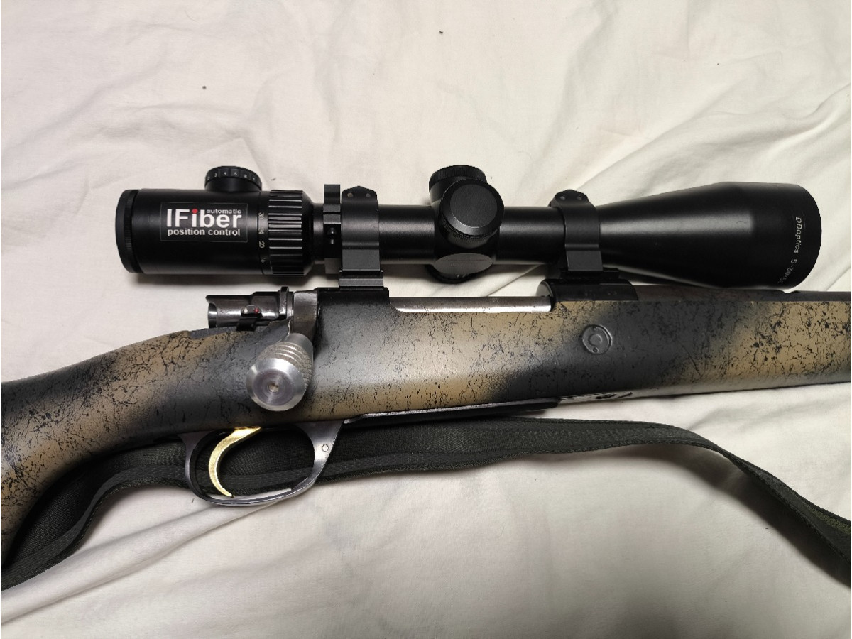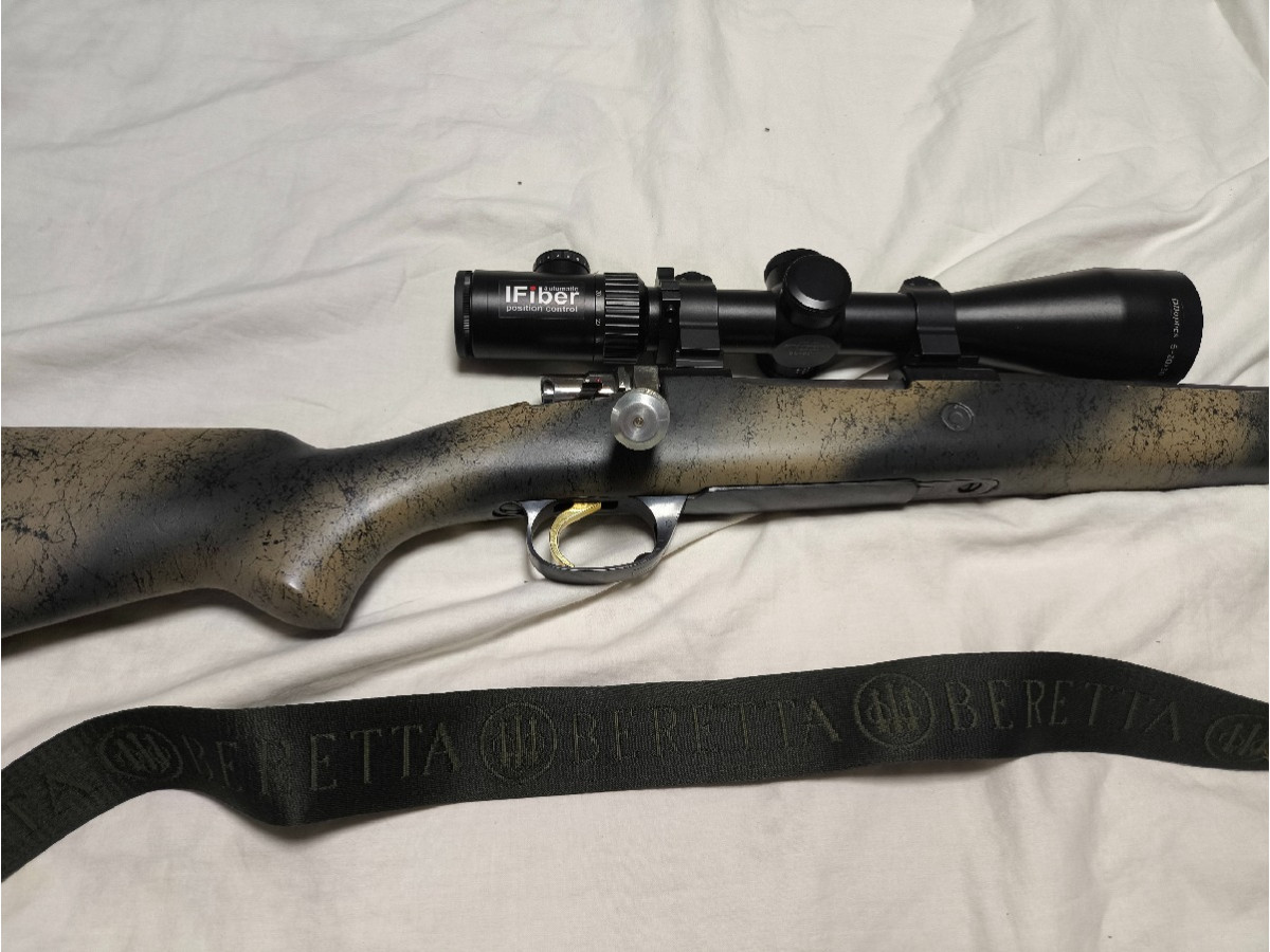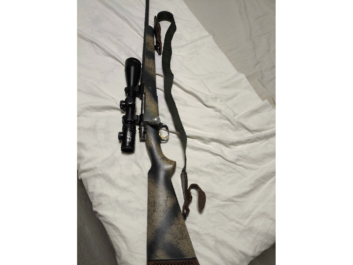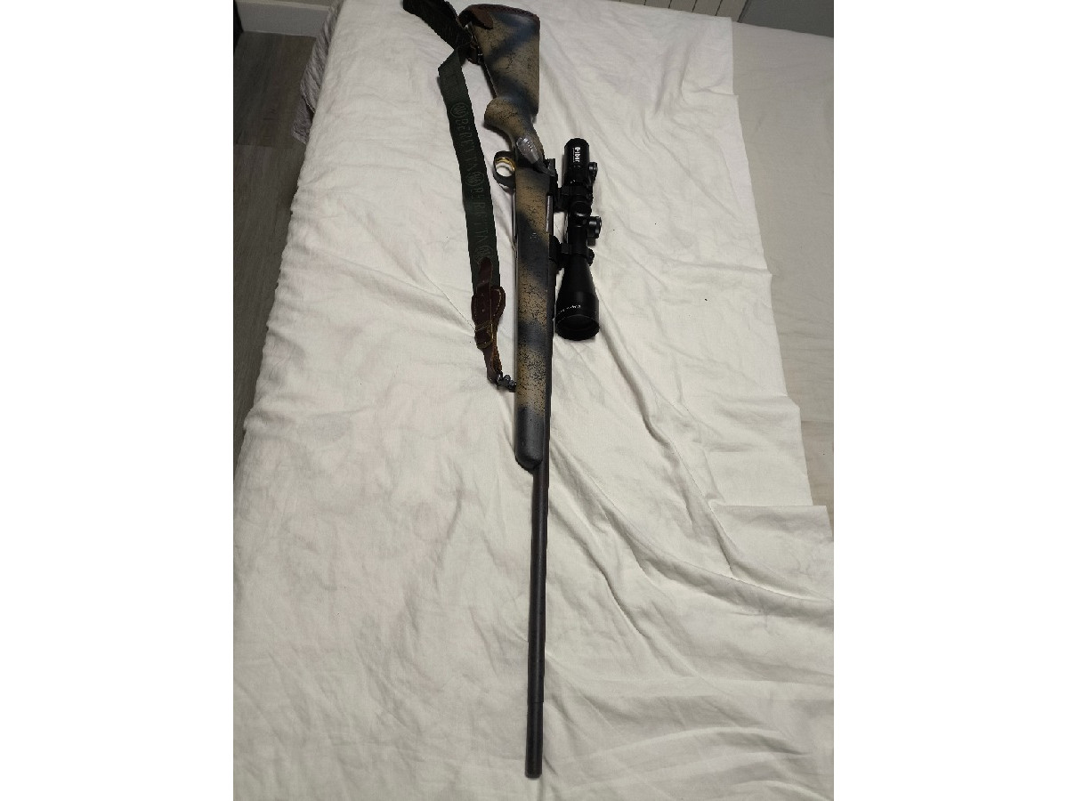 Rifle de cerrojo Santa Barbara 308 win con culata y cañón pintado en camo gatillo al pelo y perilla táctica se puede cambiar ya que está el cerrojo roscado. Bípode funda y correa beretta.