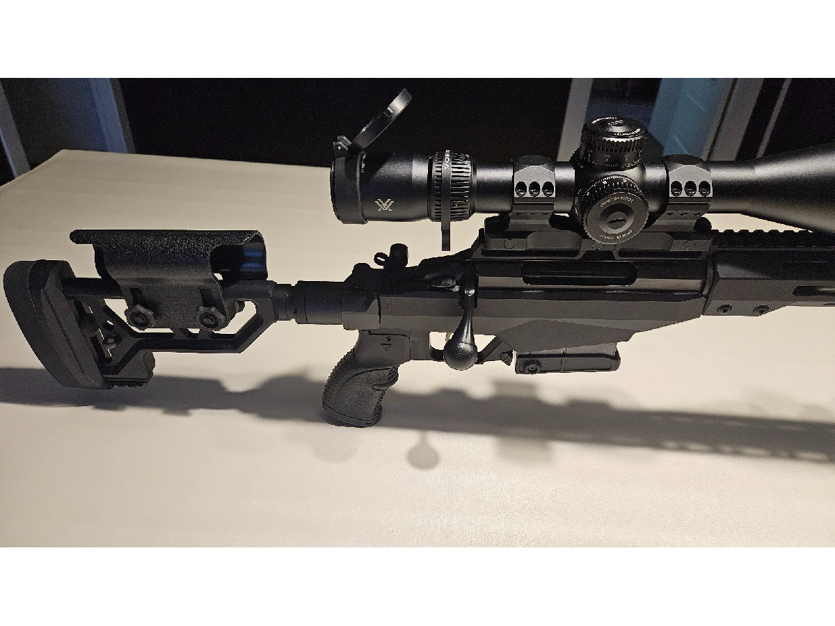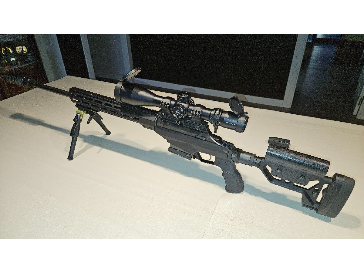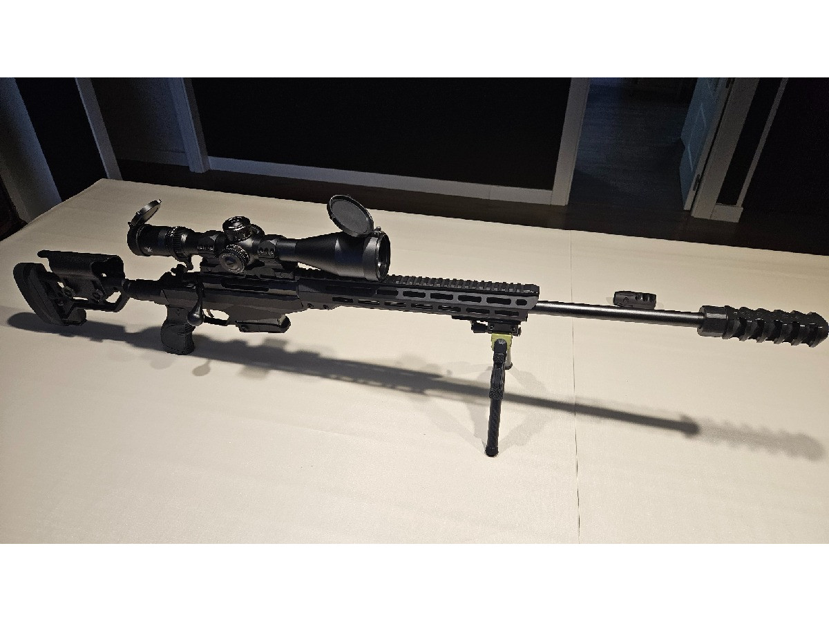 Se vende rifle con 2 frenos de boca, original y REVO (actualmente en la foto). 1 cargador de 10 balas. Bípode MDT. Visor no incluido. Disparos realizados: 300. Estado usado pero sin arañazos. Muy bien cuidado y con muchísima precisión. Funda Shutter incluida.