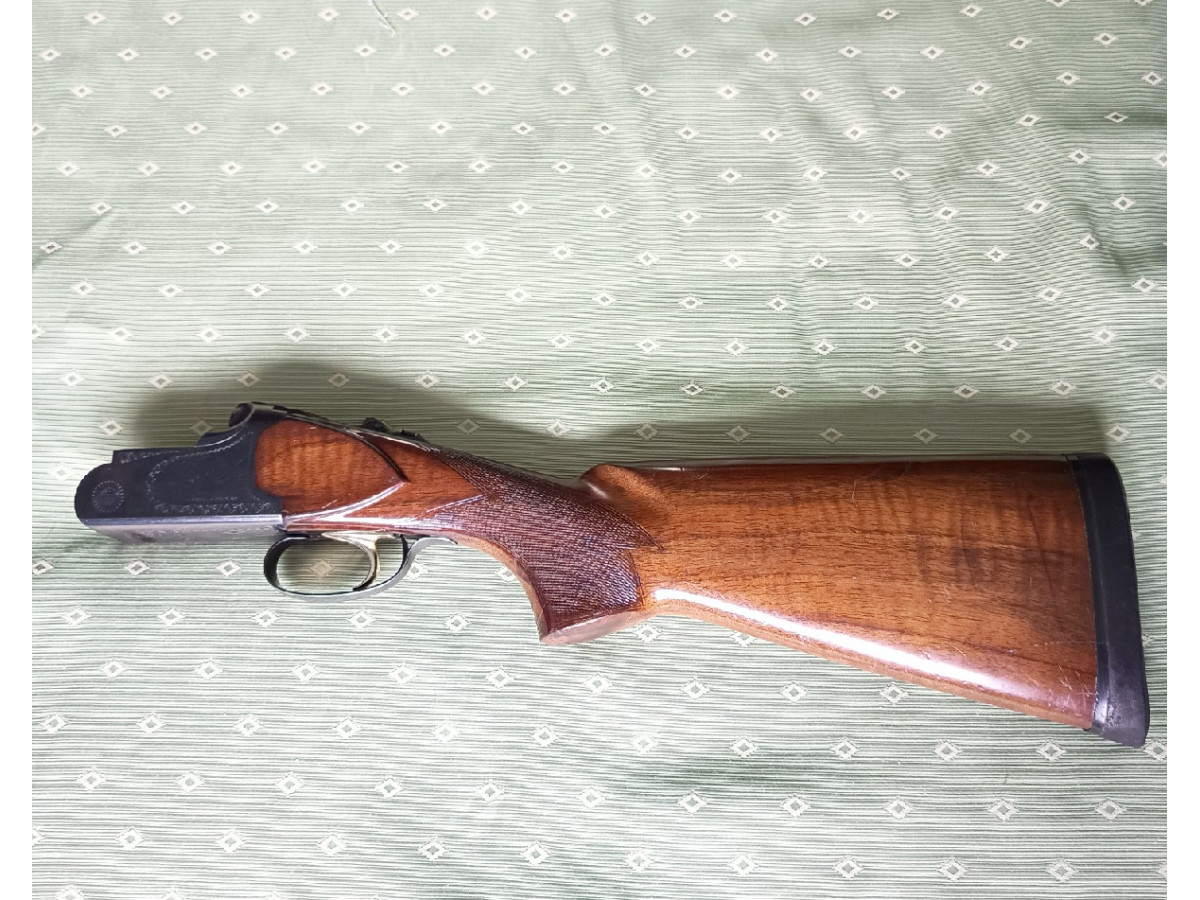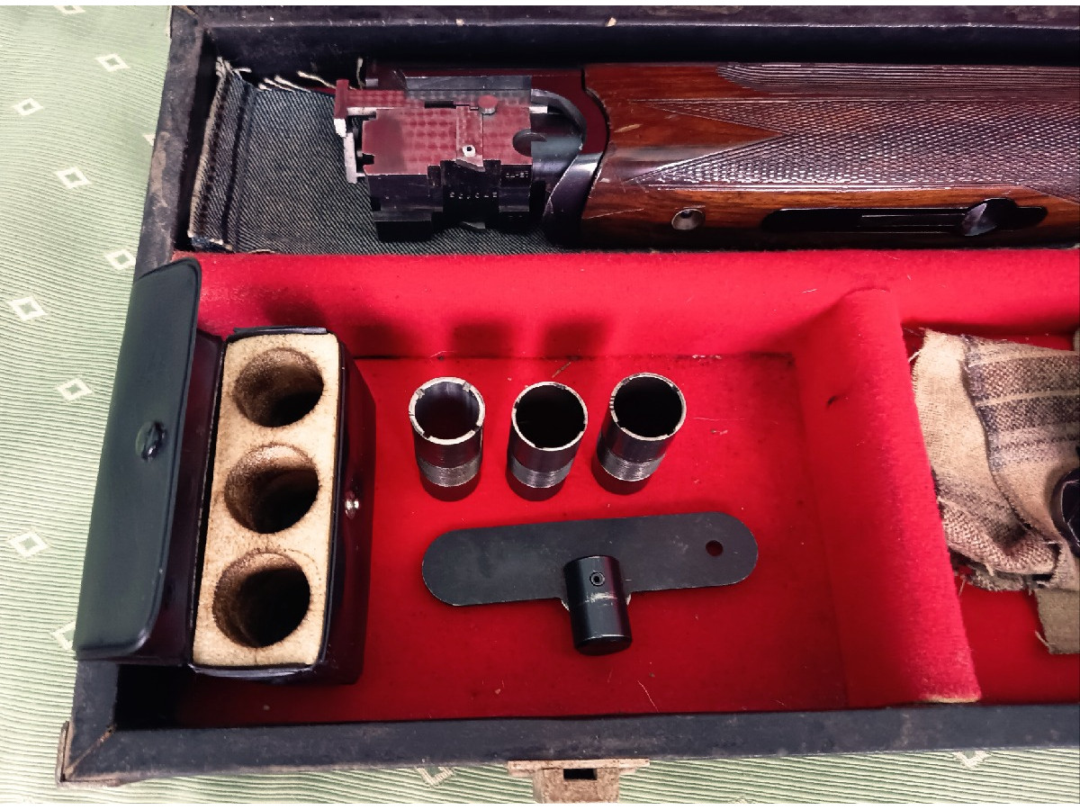 Escopeta Súper Lanber de competición calibre 12, cañón de 70, seminueva, 1 gatillo con selector de disparo y expulsora. Lleva 5 polichokes intercambiables de 1, 2, 3, 4, 5 estrellas con su llave. Muy bien cuidada, con estuche incluido.