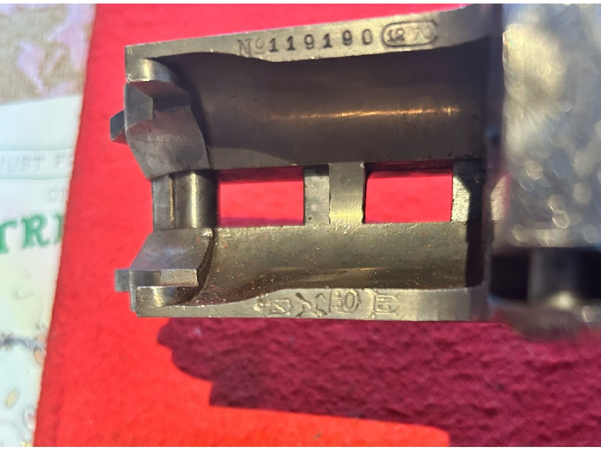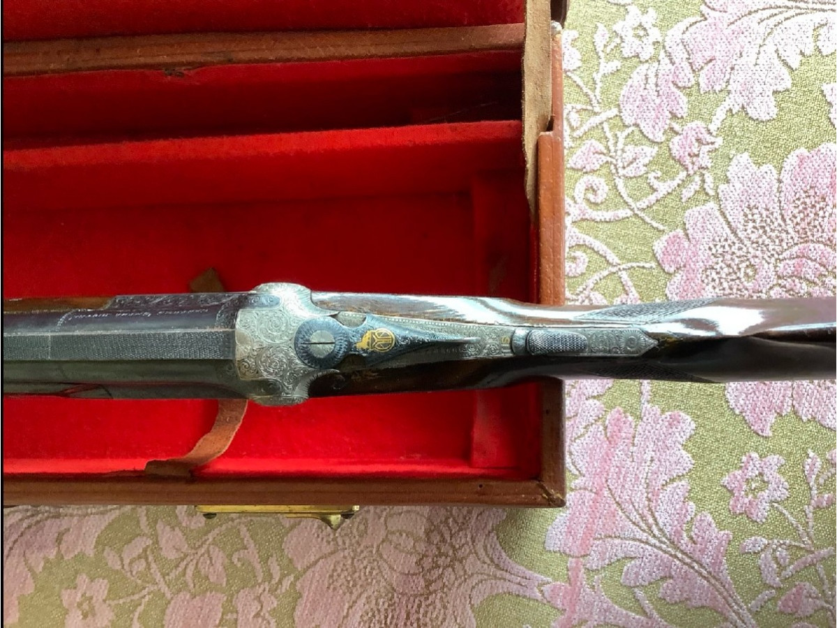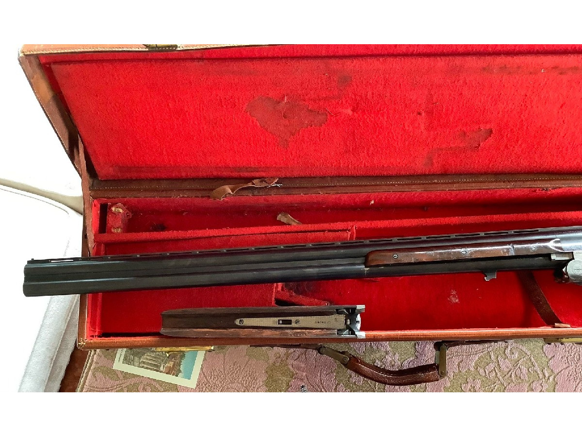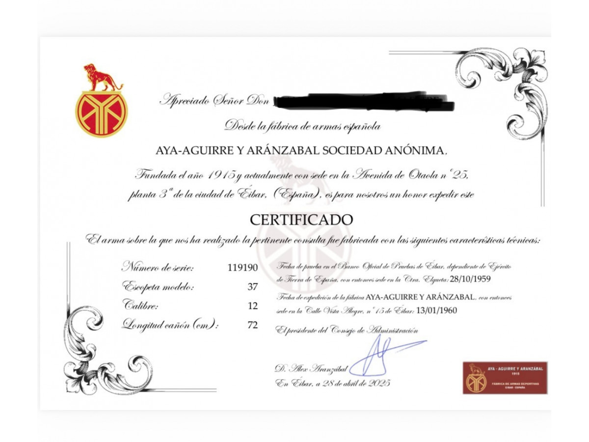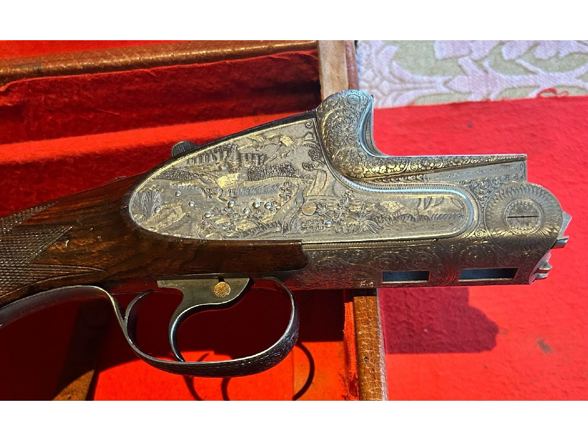 AYA (Aguirre y Arranzabal) Superpuesta. Expulsadora. Cañón de 72 cm. Pletina corrida y labrada. Inserciones de marca en oro. Monogatillo selectora. Báscula doble.