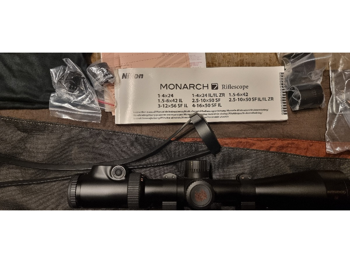 Vendo visor caza Nikon Monarch 7, con retícula iluminada, corrector paralelaje 2.5x10x50. En perfecto estado, tal cual se ve en las fotos. Opción anillas appel.