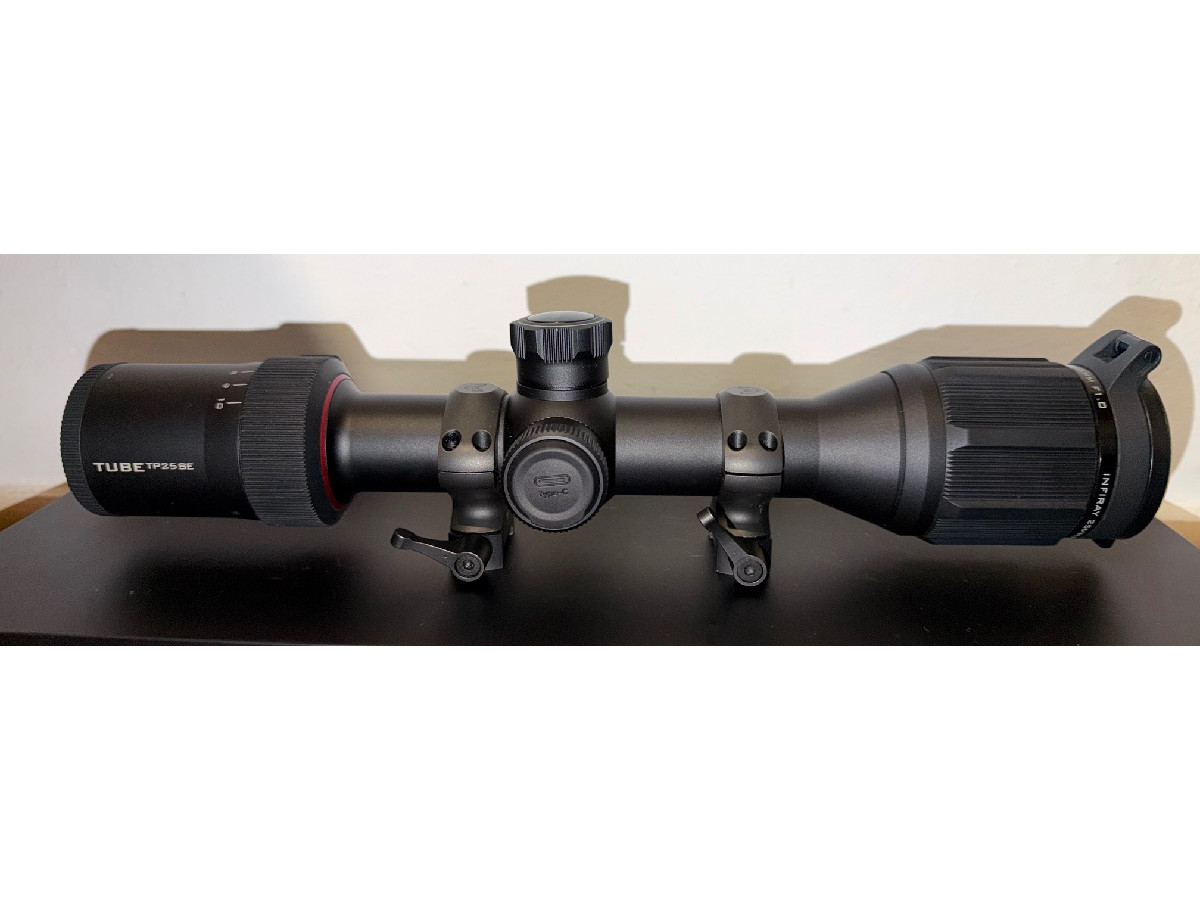 Visor térmico Infiray Tube SE en color negro. Diseñado para una visión clara en condiciones de baja visibilidad. - Cuerpo de aluminio resistente. - Ajustes de enfoque y zoom. - Incluye anillas. - Lente de 25 mm con revestimiento. - Duración de baterÃa hasta 11 h. - Todas las piezas y fundas originales. - De los más livianos del mercado, no llega a 800 gr.