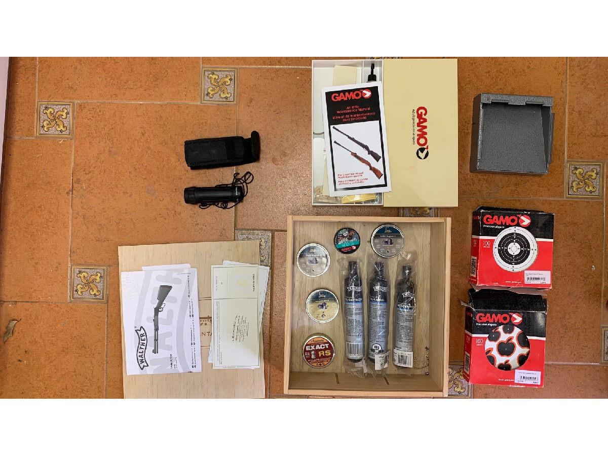 Carabina en muy buen estado, alguna leve rozadura o arañazo pero nada significativo. Lleva 2 años en un altillo sin dispararse, supongo que necesitará algo de mantenimiento, pero la última vez que se disparó funcionaba perfectamente. Incluyo kit de limpieza y mantenimiento de Gamo, 3 bombonas de CO2 (llevan años desde que las compré, no respondo por su estado), 5 cajas de balines de varios tipos, 2 cajas con papeles de dianas, plataforma de metal para colocar las dianas y recoger balines y un binocular para ver la precisión de los tiros.