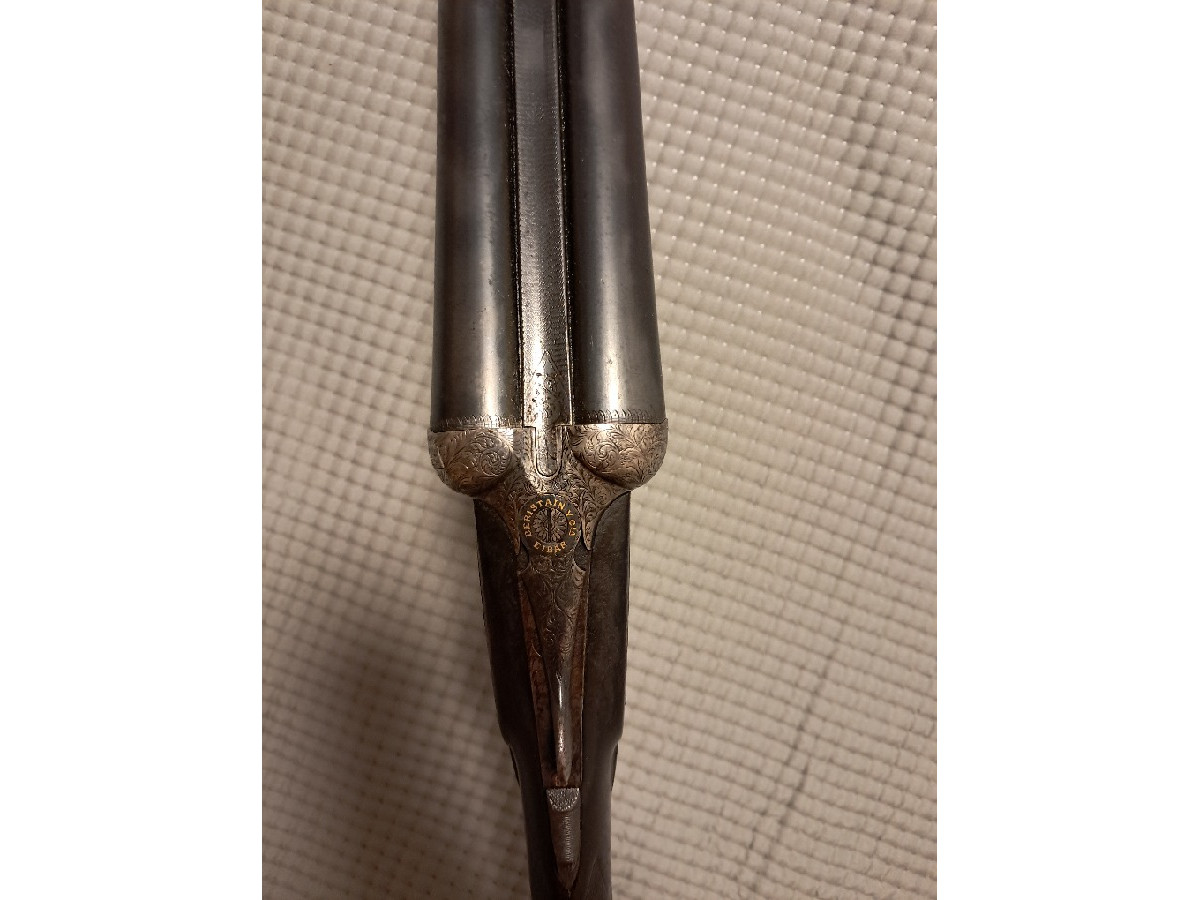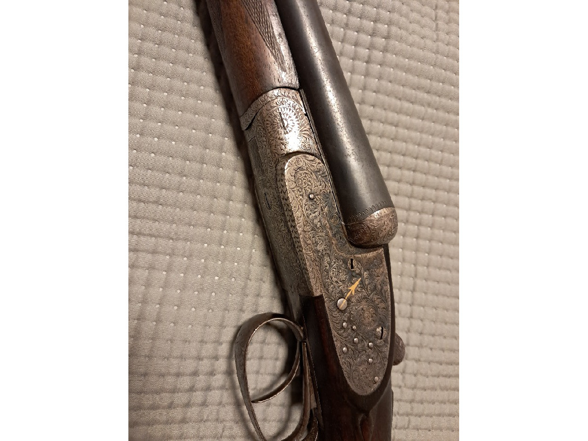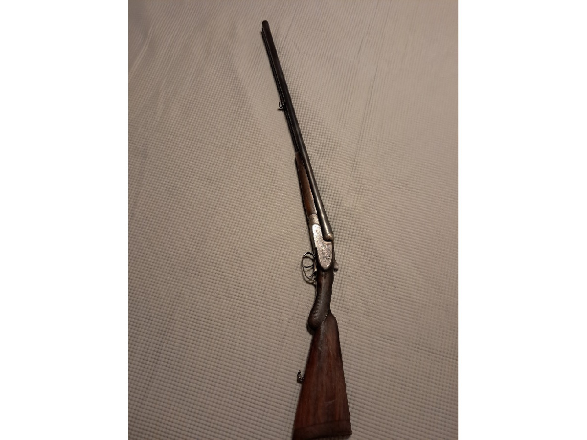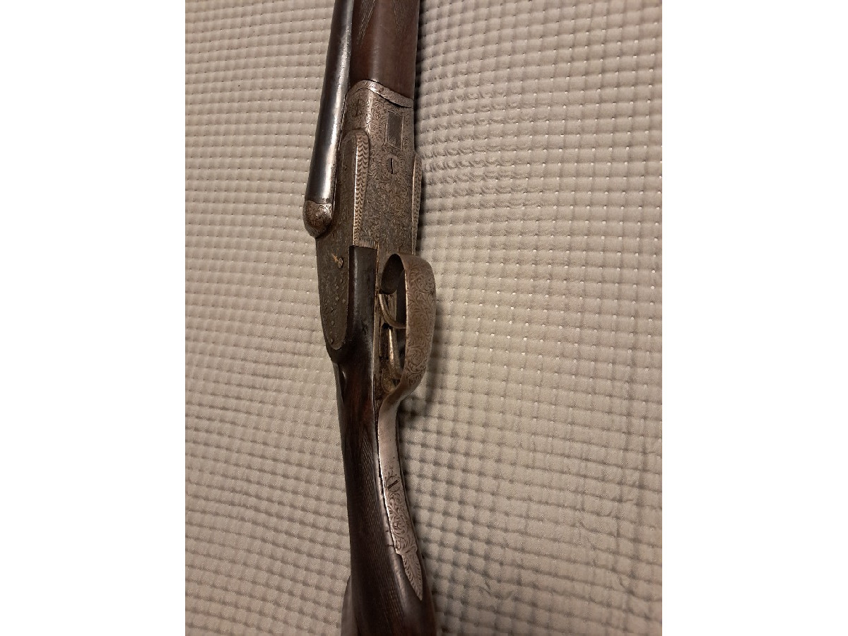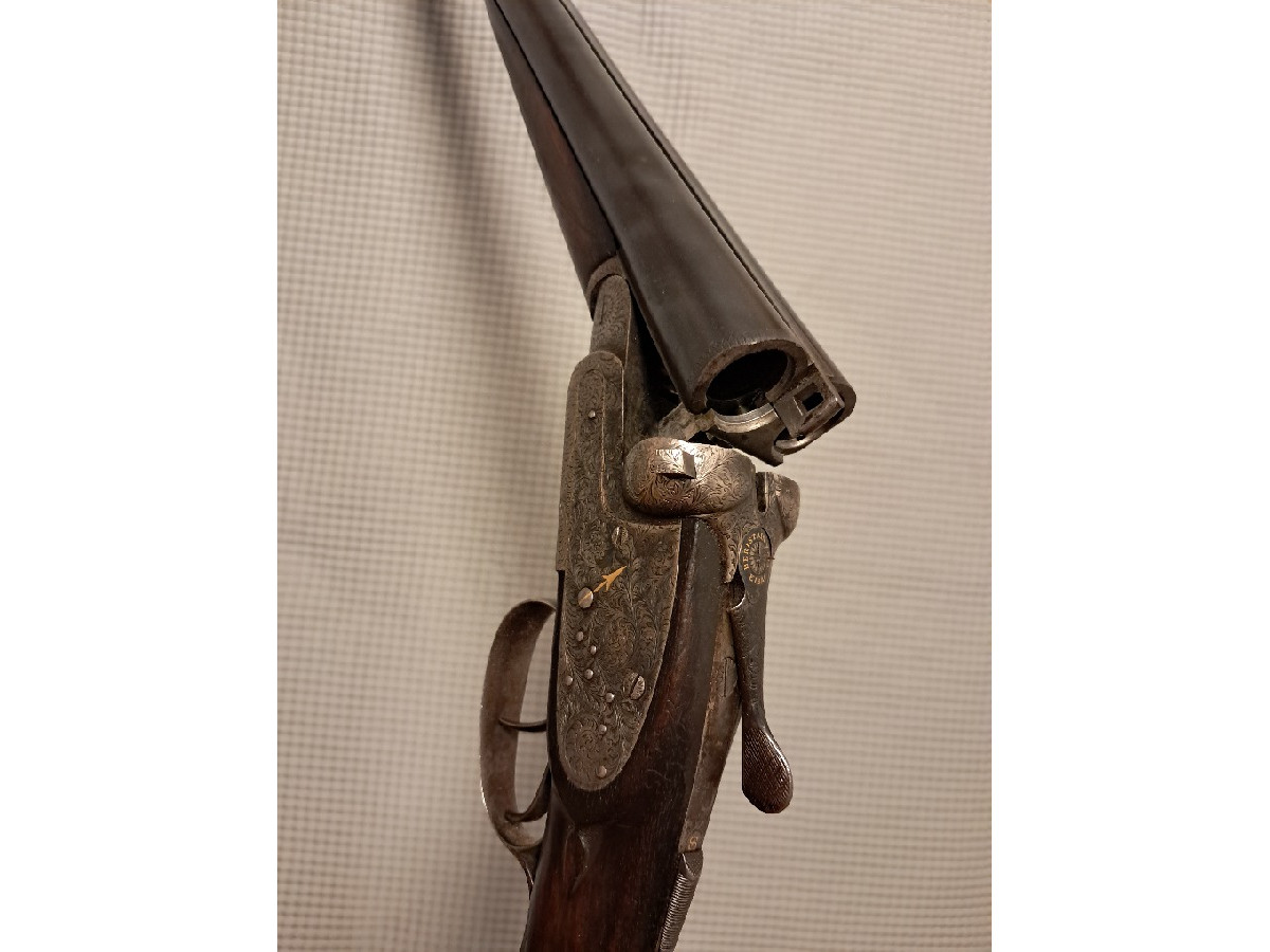 Escopeta plana, paralela, Beristain y Cia. Entera hecha a mano, grabada entera, pasador de cierre, inserciones en oro en la llave y las pletinas, nunca restaurada, funciona perfectamente.
