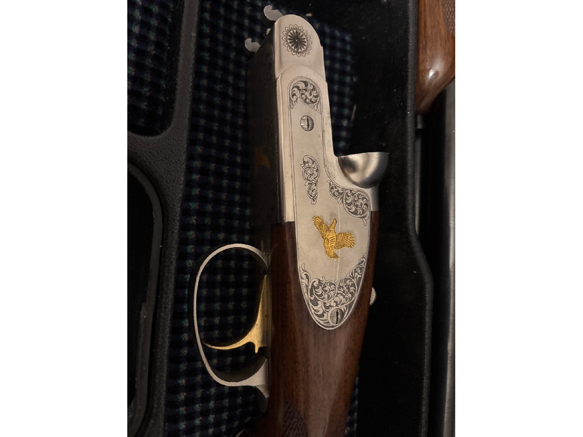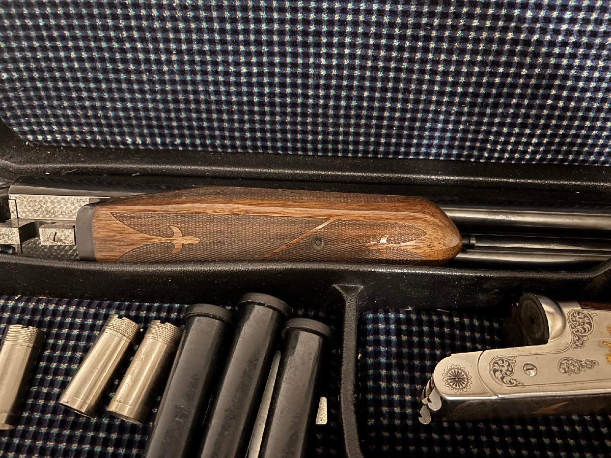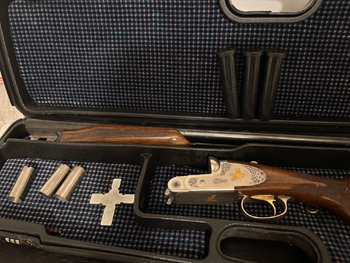 Escopeta paralela Zabala Anthea, en muy buen estado. Modelo de lujo. Grabados dorados calibre 12-76 Con 5 chokes 1-2-3-4-5 estrellas. llave incluida Mono gatillo con selector. Guardarnos cola de castor. Maletín original zabala