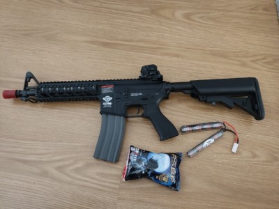 Arma de airsoft CM16 Raider de G&G en perfecto estado, en su embalaje original, con cargador lleno, batería y cargador de la misma y una bolsa de bolas para comenzar.