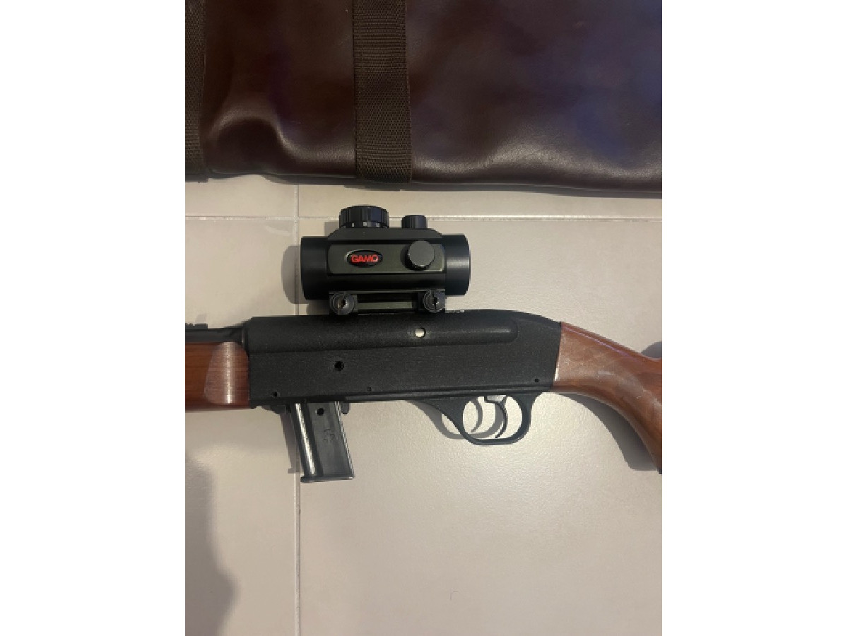 Rifle calibre 22 lr Gevarm en muy buen estado de mantenimiento y funcionamiento, con mira, punto rojo gamo con selector de intensidad del punto, cargador de 10 balas, funda de transporte y pilas de recambio para el visor .
