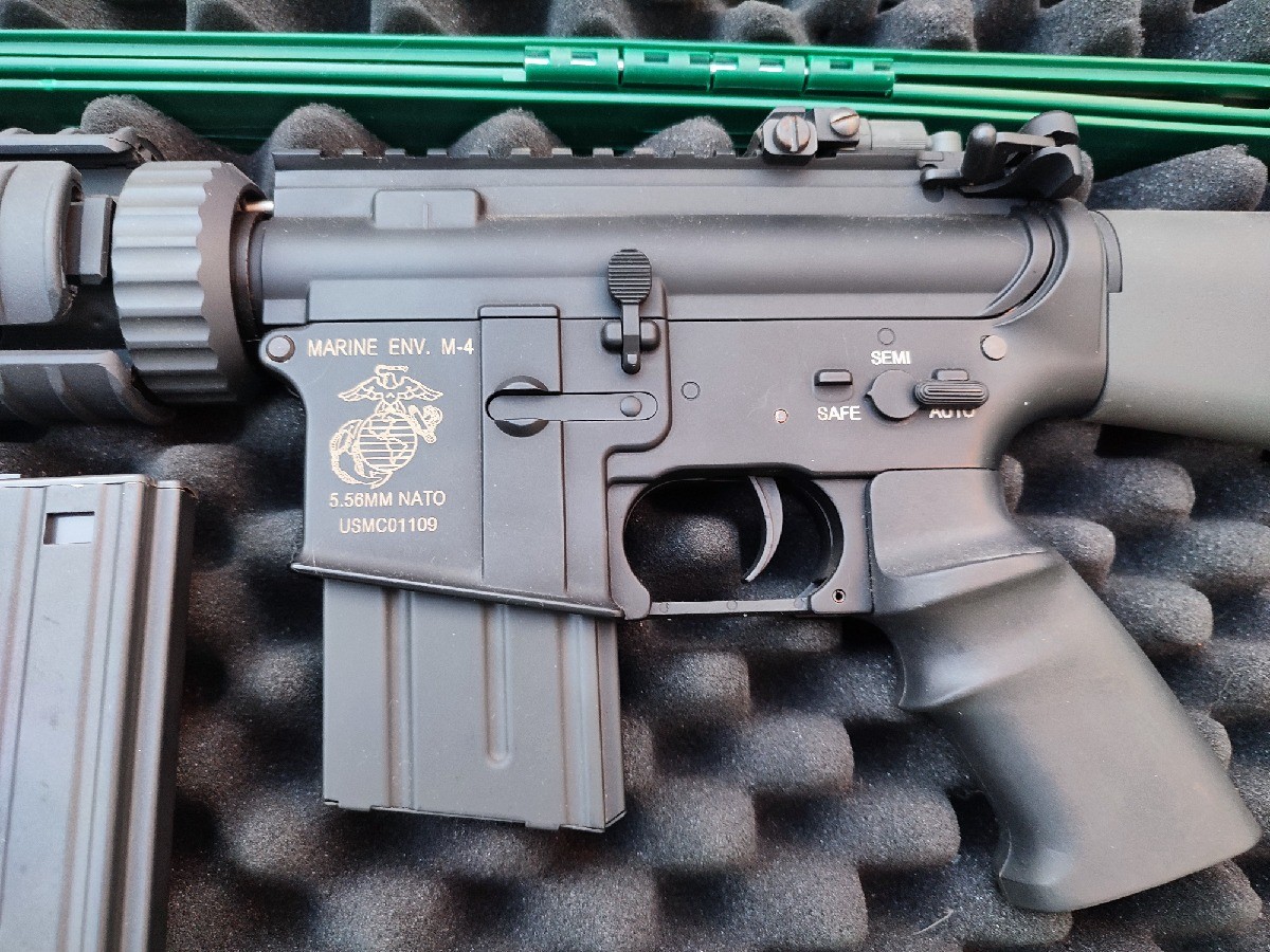 G&P SPR/A Marine Special Edition Full metal, cañón de precisión, gear box reforzado, empuñadura Sniper, bípode Marui, mira X9 original marca G&P, tres cargadores cortos más uno largo, maletín rígido incluido(valorado en más de 100 euros). 380fps de origen con 0.25,a ráfaga hace un ruido que impresiona. Menos de 5 partidas, fue un capricho y ha estado de exposición. No creo que haya muchas de estas en España, serie especial con el logo del cuerpo de marines de los Estados Unidos.