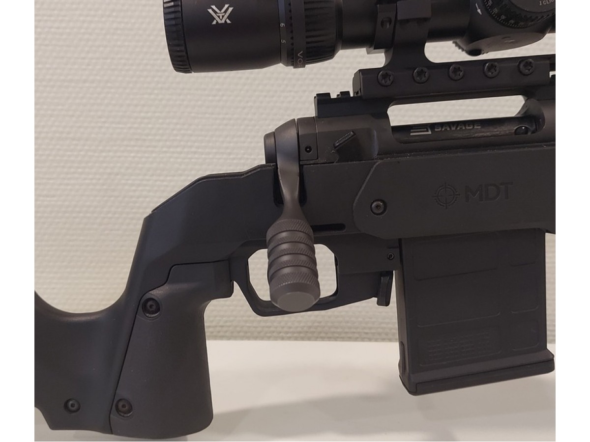 El chasis es una MDR XRS , hay un video de Bassam que habla de esta culata . El chasis es 100% de aluminio, recubierto de un polímero que le da un agarre muy bueno. Tiene dos pistoletes, uno vertical y otro para colocar la mano con mayor ángulo. La culata es totalmente adaptable, tanto en altura de la carrillera como en longitud. Tiene un carril picatinny en la parte inferior del guardamano.